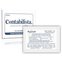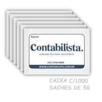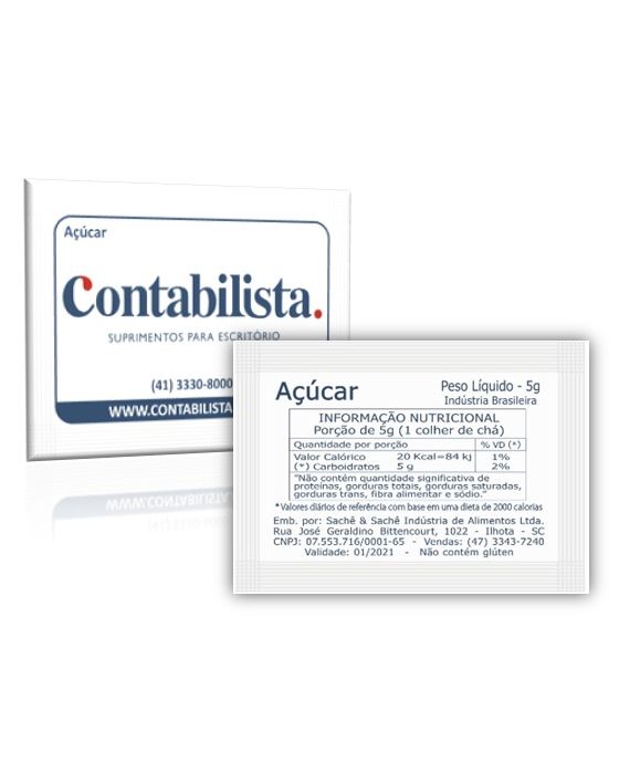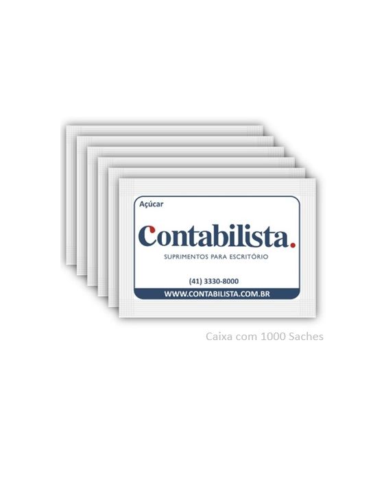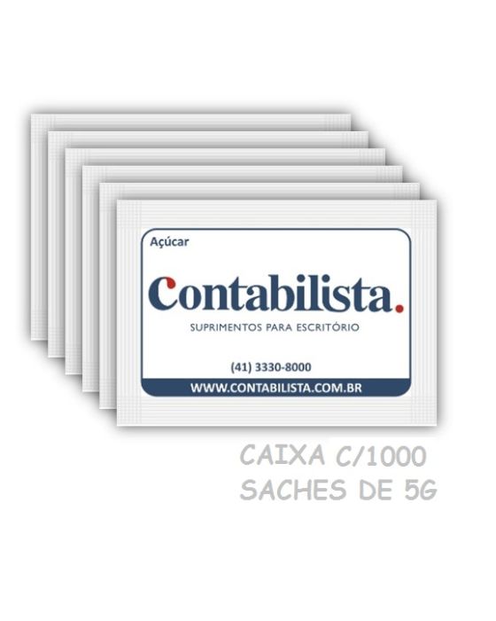 Caracteristicas: - Açúcar refinado sachê - 5g cada sachê - caixa: 1000 unidades. - Marca: Contabilista - Tipo de açúcar: Refinado T1 - Produzido por CNPJ: 07.753.716/0001-65 - Tamanho: 50mmx70 mm (padrão europeu)FICHA TÉCNICAProduto: Açúcar Ref. Granulado tipo exportaçãosaches com 5g / cada (1.000 x 5g)Utilização:Adoçar cafés, sucos, chás, etc...Ingredientes:Açúcar Refinado Granulado tipo exportação com cor ICUMSA 45 # 420mm e granulometria entre 0,45 e 0,65mm de AM(*) Valores diários com base em uma dieta de 2.000 Kcal ou 8.400KJ. Seus valores podem ser maiores ou menores dependendo de suas necessidades energéticas* As especificações podem ser alteradas sem aviso prévio ** Imagem meramente ilustrativa.