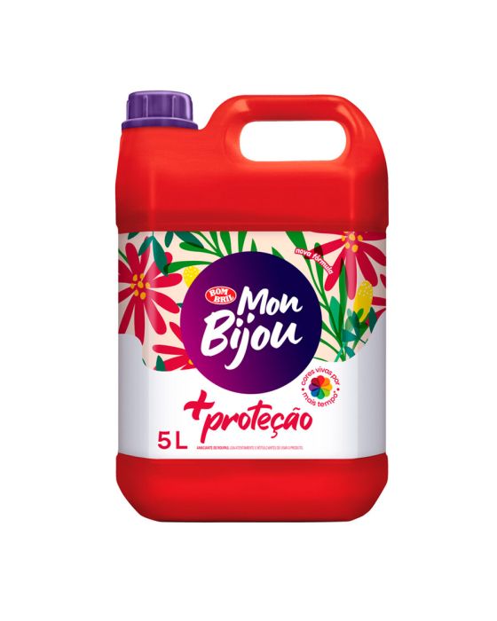 Características:Com o novo Mon Bijou suas roupas terão um cuidado especial. A nova fórmula contém aditivo de proteção às cores e as roupas terão cores vivas por mais tempo!Detalhes: - Marca: Mon Bijou.- Fabricante: Bombril.- Linha: Mais proteção.- Tipo: Amaciante de roupas.- Volume: 5 Litros.- Contém: 1 unidade do produto.- cores vivas por mais tempo.Válido por 3 anos a partir da data de fabricação.Modo de usar: - Após a lavagem completa, adicione 80 ml (equivalente a um copo americano) de Mon Bijou diretamente no reservatório ou diluído em água limpa e enxágue novamente.Composição:- Cloreto de diestearil dimetil amônio, coadjuvante, conservantes, espessantes, corantes, fragrâncias e água.Recomendações:- Use sempre a dosagem recomendada, siga as orientações de lavagem contidas nas etiquetas das roupas.- Nunca adicione diretamente sobre as roupas.- Lave o copo usado para medição antes de reutilizá-lo.Precauções:- Não ingerir, em caso de ingestão não provoque vômito e procure imediatamene um médico.- Evite a inalação, aspiração, contato com os olhos e a pele, em caso de contato, lave imediatamente com água em abundância.- Mantenha o produto em sua embalagem original. Não misture com outros produtos.- Nao reutilize a embalagem para outros fins.* Leia atentamente o rótulo antes de usar o produto.ATENÇÃO: CONSERVE FORA DO ALCANCE DAS CRIANÇAS E DOS ANIMAIS DOMÉSTICOS.* As especificações podem ser alteradas sem aviso prévio ** Imagem meramente ilustrativa