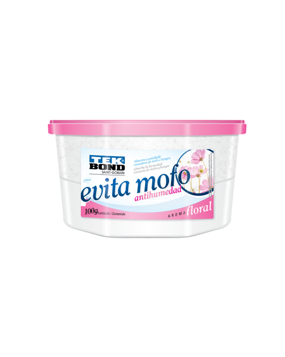 Caracteristicas:- O Evita-Mofo Tekbond é um desumidificador de extrema eficiência que, além de remover a umidade do ambiente, ainda deixa uma leve fragrância enquanto age. - Evita problemas com mofo, fungos e mal odor em armários, gavetas, guarda-roupas, baús, dispensas, sapateiras, cofres, barcos, bibliotecas, estoque de madeiras, ambientes fechados e úmidos, com baixa ou nenhuma circulação de ar, entre diversos outros. O Evita Mofo absorve a umidade do ambiente e armazena a água no pote.MODO DE USO:- 1.Limpe o local onde tiver mofo antes de colocar o evita mofo. - 2.Remova a tampa da embalagem e retire o lacre de alumínio, com cuidado para não remover ou danificar o filtro branco que fica embaixo dele.- 3.Tampe a embalagem e coloque no local.- 4.Pronto! Ação do produto é iniciada de imediato.- 5.Quando o nível de água atingir o limite máximo indicado no rótulo da embalagem, substitua por um novo Evita-Mofo Tekbond.- Aparência (visual / cor): Grânulos branco ou cinza-Atenção: Descarte o líquido acumulado no ralo e a embalagem no local de plásticos recicláveis. Se o líquido vazar do recipiente pode danificar o que entrar em contato (roupas, material de couro, livros etc.). Se o filtro branco rasgar ou a embalagem quebrar pare de usar e descarte o produto.* As especificações podem ser alteradas sem aviso prévio ** Imagem meramente ilustrativa