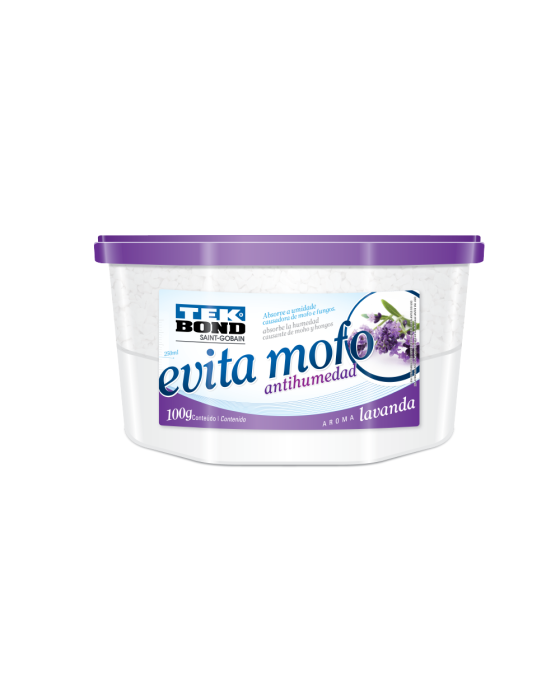 Caracteristicas:- O Evita-Mofo Tekbond é um desumidificador de extrema eficiência que, além de remover a umidade do ambiente, ainda deixa uma leve fragrância enquanto age. - Evita problemas com mofo, fungos e mal odor em armários, gavetas, guarda-roupas, baús, dispensas, sapateiras, cofres, barcos, bibliotecas, estoque de madeiras, ambientes fechados e úmidos, com baixa ou nenhuma circulação de ar, entre diversos outros. O Evita Mofo absorve a umidade do ambiente e armazena a água no pote.MODO DE USO:- 1.Limpe o local onde tiver mofo antes de colocar o evita mofo. - 2.Remova a tampa da embalagem e retire o lacre de alumínio, com cuidado para não remover ou danificar o filtro branco que fica embaixo dele.- 3.Tampe a embalagem e coloque no local.- 4.Pronto! Ação do produto é iniciada de imediato.- 5.Quando o nível de água atingir o limite máximo indicado no rótulo da embalagem, substitua por um novo Evita-Mofo Tekbond.- Aparência (visual / cor): Grânulos branco ou cinza-Atenção: Descarte o líquido acumulado no ralo e a embalagem no local de plásticos recicláveis. Se o líquido vazar do recipiente pode danificar o que entrar em contato (roupas, material de couro, livros etc.). Se o filtro branco rasgar ou a embalagem quebrar pare de usar e descarte o produto.* As especificações podem ser alteradas sem aviso prévio ** Imagem meramente ilustrativa
