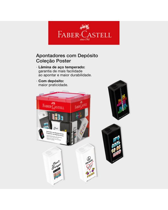 Características:Chegaram os apontadores pôster, para trazer mais uma novidade para o seu estojo!A qualidade dos apontadores Faber-Castell em 4 novas estampas atuais, modernas e colecionáveis para você escolher a sua preferida! O apontador com depósito garante maior praticidade, além de possuir lâmina de aço temperado que traz mais facilidade ao apontar.Detalhes:- Marca: Faber Castell;- Modelo: Pôster;- Referência: 125POSZF;- Linha: Apontadores;- Tipo: Com depósito;- Cores: Branco e Preto (Cores sortidas);- Quantidade de furos: 1 Furo;- Contém: 1 unidade do produto;- Com depósito, garantindo maior praticidade;- 4 opções de estampas/frases;- Visual Atual, Moderno e Colecionável.Composição:- Apontador: Plástico;- Lâmina: Aço temperado.Cores sortidas, será enviado de acordo com a disponibilidade do estoque. Não é possível escolher uma cor específica.* As especificações podem ser alteradas sem aviso prévio ** Imagem meramente ilustrativa.