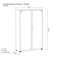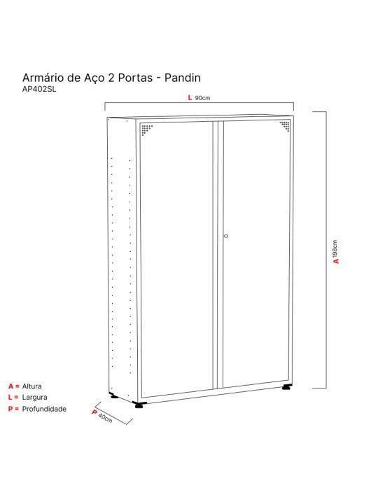 Características:Os armários de aço são práticos e funcionais. Auxiliam na organização e facilitam o dia a dia. Com excelente espaço interno, todos os armários da linha de aço são ideais para organizar materiais de escritório, livros, pastas e documentos.Detalhes:- Marca: Pandin.- Modelo: AP402SL.- Linha: Armário de Aço.- Cor: Cinza.- Portas: 2 Portas.- Material: Aço.- Capacidade de peso: Suporta até 20kg por prateleira.- Quantidade de prateleiras: 4 prateleiras.Onde usar:- Escritórios: Organização de materiais de escritório, livros, pastas e documentos.- Área de serviço: Organização de materiais de limpeza, tolahas, tapetes e etc.- Dispensa: Organização de alimentos e utentílios domésticos.Medidas:- Largura: 90cm.- Altura: 198cm.- Profundidade: 40cm.*Produto enviado desmontado* As especificações podem ser alteradas sem aviso prévio ** Imagem meramente ilustrativa.