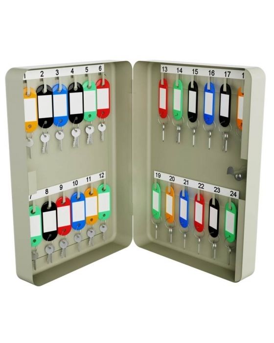 Características:- Cor: Bege- Capacidade: 24 Chaves- Possui chave de segurança- Construído em caixa de Aço- Dimensões: 250 x 83 mm x 182 mm- Acompanha 24 chaveiros em 5 cores: Verde, Laranja, Vermelho, Preto e Azul- Cartela para enumeração das chaves- 2 parafusos com buchas para fixação na parede* As especificações podem ser alteradas sem aviso prévio ** Imagem meramente ilustrativa.