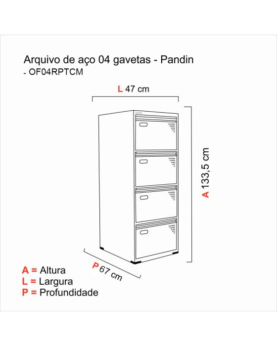 Características:Os arquivos de aço são excelentes aliados na hora de organizar a rotina. Práticos, duráveis e muito funcionais, eles facilitam as ações diárias, deixando pastas e documentos importantes organizados, protegidos e sempre a mão!Detalhes:- Marca: Pandin.- Modelo: OF4RPTCM.- Linha: Arquivo de Aço.- Cor: Cinza.- Gavetas: 4 gavetas.- Material: Aço.- Capacidade de peso: Suporta até 45kg por gaveta.- Itens inclusos: Chave e Kit Pés.- Porta-etiqueta e puxadores estampados nas gavetas.- Puxadores com acabamento em PVC nas cor grafite.- Fechadura cilíndrica tipo yale com travamento simultâneo em todas as gavetas.- Sistema de deslizamento das gavetas por trilho e corrediças telescópico.Onde usar:- Escritórios: Organização de livros, pastas e documentos.Arquivo Econômico:- Tamanho: Ofício- Tamanho da caixa: 60cm x 50cm x 1,35m.Medidas:- Largura: 47cm.- Altura: 133,5cm.- Profundidade: 67cm.Estrutura:- Confeccionado em chapa de aço nº 26 (0,45mm, nas Laterais ou Corpo).Acabamento:- Tratado pelo processo anti-corrosivo à base de fosfato de zinco e pintura eletrostática a pó com camada de 30 a 40 mícrons com secagem em estufa a 240 ºC (na cor cinza cristal) ou pintura em esmalte sintético com camada de 30 a 40 mícrons com secagem em estufa a 120 ºC (nas outras cores).Informações sobre o envio:- Arquivo enviado montado para Curitiba/PR- Demais cidades o arquivo é enviado desmontado* As especificações podem ser alteradas sem aviso prévio ** Imagem meramente ilustrativa