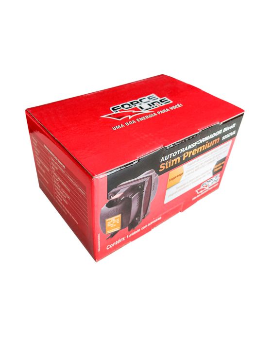 Caracteristicas: Autotransformador Slim Premium Force Line- 1050 VA- Bivolt- 10A- Cordão para ligação incluso- Fusível térmico rearmávelEspecificações- Potência: 1050 VA- Fusível térmico: Se ligar um equipamento que exceda a potência do autotransformador, o aumento da temperatura próximo a 130°C faz o fusível desligar oequipamento.Quando a temperatura baixa próximo a 70°C ele volta a funcionar.- Entrada / Saída: Transforma 120V em 220V, ou 220V em 120V. - Bivolt- Frequência: 60Hz- Gabinete: Caneca plástica- Sem alça- Adaptador: Exclusivo sistema de W, que elimina o risco de choques elétricos.- Cordão: 3 x 0,75mm² 80 cm de acordo com as normas de plugues e tomadas NBR14136- Tiomadas: Tomada elétrica tripolar- Cor: Preto- Dimensões: 16,5 x 11,5 x 10cm- Peso: 2,2kg- Conteúdo da embalagem: 1 autotransformador, 1 cordão de ligação, 1 adaptador tripolar.- Garantia: 3 mesesRegra de conversão de VA para Watts ou Watts para VA:- Conversão de VA para Watts: Potência em VA divide por 1,66- Conversão de Watts para VA: Potência em Watts multiplica por 1,66 * As especificações podem ser alteradas sem aviso prévio ** Imagem meramente ilustrativa