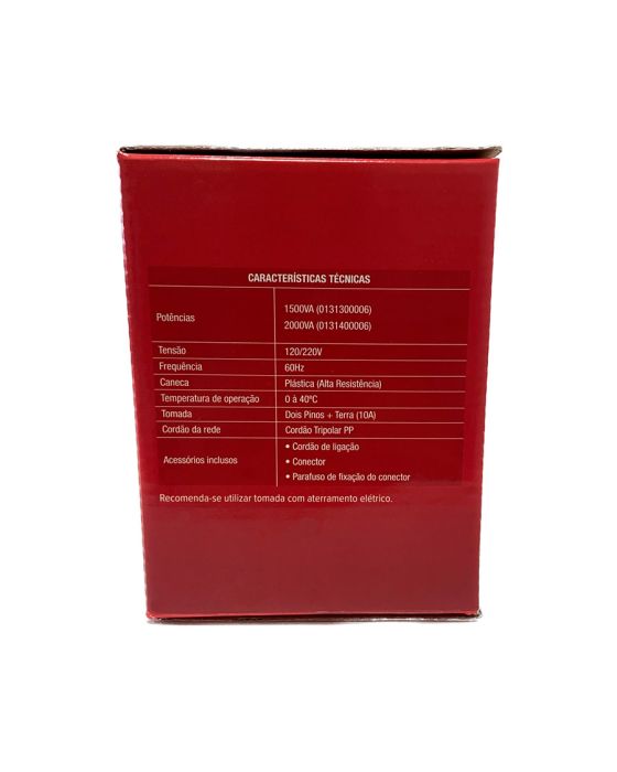 Caracteristicas: Autotransformador Slim Premium Force Line- 2000 VA- Bivolt- 10A- Cordão para ligação incluso- Fusível térmico rearmável- Modelo: 0131400006- Marca: Force LineEspecificações- Cor: Preto- Gabinete: Caneca plástica- Dimensões: 19 x 11,5 x 14,5cm- Peso: 3,7kg- Bivolt- Potência: 2000 VA- Entrada / Saída: Transforma 120V em 220V, ou 220V em 120V.- Frequência: 60Hz- Fusível térmico: Se ligar um equipamento que exceda a potência do autotransformador, o aumento da temperatura próximo a 130°C faz o fusível desligar oequipamento.Quando a temperatura baixa próximo a 70°C ele volta a funcionar.- Tiomadas: Tomada elétrica tripolar 10A- Adaptador: Exclusivo sistema de W, que elimina o risco de choques elétricos.- Cordão: 3 x 0,75mm² 80 cm de acordo com as normas de plugues e tomadas NBR14136- Sem alça- Conteúdo da embalagem: 1 autotransformador, 1 cordão de ligação, 1 adaptador tripolar.- Garantia: 3 mesesRegra de conversão de VA para Watts ou Watts para VA:- Conversão de VA para Watts: Potência em VA divide por 1,66- Conversão de Watts para VA: Potência em Watts multiplica por 1,66 * As especificações podem ser alteradas sem aviso prévio ** Imagem meramente ilustrativa