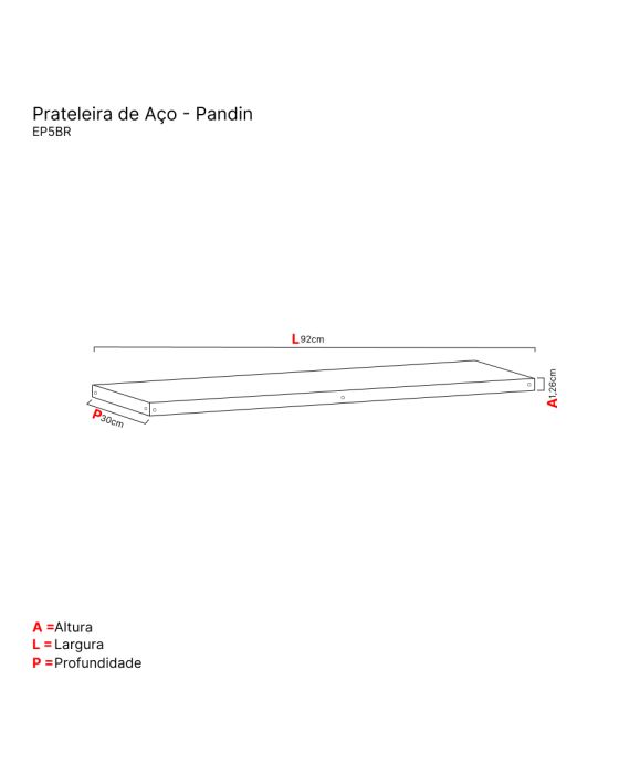 Características:Praticidade e versatilidade são as palavras chaves que definem esses móveis tão funcional, além de duráveis e resistentes, possui o melhor custo benefício. A funcionalidade das estantes de aço vai muito álem do ambiente de escritório ou área de serviço. Elas funcionam muito bem como divisor de ambientes, e ficam lindas quando você compõe com itens decorativos e plantas.Detalhes:- Marca: Pandin;- Referência: EP5BR;- Linha: Prateleiras para Estantes- Cor: Cinza- Quantidade: 5 prateleiras;- Contém: 1 embalagem com 5 prateleiras;- Material: Aço;- Volume (Caixa): Único;- Somente as prateleiras.Acabamento:- Tratado pelo processo anti-corrosivo à base de fosfato de zinco e pintura eletrostática a pó com camada de 30 a 40 mícrons com secagem em estufa a 240 ºC (na cor cinza cristal).Estrutura:- Prateleira: Confeccionada em chapa nº 26 (0,045cm) com dobras duplas e rebatidas nas laterais (4 dobras perpendiculares sendo a 1ª 1,2cm rebatida, a 2ª a 3cm com 90°, a 3ª a 91,5cm com 90°, a 4ª a 3cm com 90º e termina com 1,2cm), e triplas nas partes frontais e posteriores (6 dobras perpendiculares sendo 1ª a 1cm com 90º, a 2ª a 1cm com 90º, a 3ª a 3cm com 90º, a 4ª a 30cm com 90º, a 5ª a 3cm a 90º e a 6ª com 1cm com 90º e termina com 1cm).Medidas:- Largura: 92cm;- Altura: 1,25cm;- Profundidade: 30cm.IMPORTANTE!* Não acompanha os pés, adquirir a estante completa, acesse: https://www.contabilista.com.br/estante-de-aco-6-prateleiras-ep6avu-cc-cinza-30cm-pandin.html* As especificações podem ser alteradas sem aviso prévio** Imagem meramente ilustrativa.