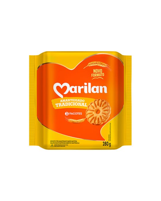 Características:Os Amanteigados Marilan apresentam variedade de sabores que conquistam na primeira mordida. - Linha: Amanteigado - Sabor: Original - Peso: 280gAs suas melhores lembranças em família sempre serão acompanhadas pelos nossos deliciosos biscoitos amanteigados.Farinha de Trigo Fortificada com Ferro e Ácido Fólico, Açúcar, Gordura Vegetal (Soja, Palma), Açúcar Invertido, Amido, Sal, Fermentos Químicos Bicarbonato de Amônio (INS 503ii) e Bicarbonato de Sódio (INS 500ii), Acidulante Ácido Láctico (INS 270), Emulsificante Lecitina de Soja (INS 322), Aromatizante, Melhorador de Farinha Metabissulfito de Sódio (INS 223).CONTÉM GLÚTEN.Contém traços de leite ou derivados, nozes, amendoim e coco.Conservar em local seco, fresco e inodoro. Após aberta a embalagem, manter o produto em recipiente tampado em local fresco.Porção: 30g ou 8 unid * As especificações podem ser alteradas sem aviso prévio ** Imagem meramente ilustrativa / acessórios da foto apenas pra composição da ambientação, não acompanham o produto.