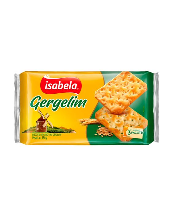 Caracteristicas:Isabela é da colônia de Bento Gonçalves (RS) e faz deliciosos biscoitos há mais de 65 anos acompanhando histórias da vida de milhares de famílias. Suas receitas guardam segredos de gerações e jeitinho dos colonos italianos de preparar. A marca é líder na região Sul.Detalhes:- Marca: Isabela.- Tipo: Salgado.- Linha: Biscoito.- Sabor: Gergelim.- Peso: 350g- Quantidade da embalagem: 3 pacotes.- Contém: 1 embalagem com 3 pacotes de biscoito.Ingredientes:- farinha de trigo enriquecida com ferro e ácido fólico, gordura vegetal, gergelim, açúcar invertido, sal, extrato de malte, emulsificante lecitina de soja, fermento químico bicarbonato de sódio e melhorador de farinha metabissulfito de sódioALÉRGICOS: CONTÉM DERIVADOS DE CEVADA, DE SOJA E DE TRIGO. PODE CONTER AVEIA, AVELÃS, CENTEIO E LEITE.CONTÉM GLÚTEN.* As especificações podem ser alteradas sem aviso prévio ** Imagem meramente ilustrativa / acessórios da foto apenas pra composição da ambientação, não acompanham o produto.