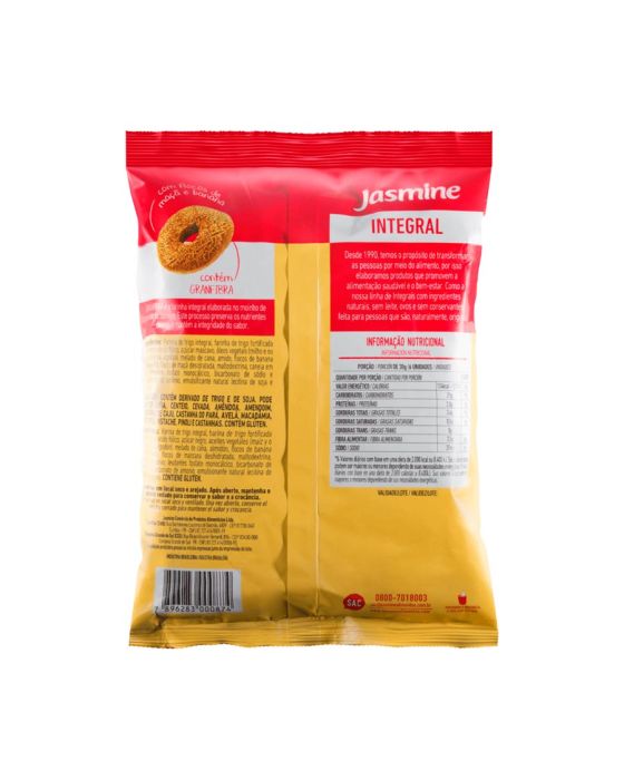 Caracteristicas:Desde 1990, elaboramos produtos que promovem a alimentação saudável e o bem-estar das pessoas. Como a nossa linha de integrais com ingredientes naturais, sem leite, ovos, e sem conservantes, feita para pessoas que são, naturalmente, originais.Detalhes:- Marca: Jasmine.- Modelo: Biscoito Integral.- Linha: Integral.- Sabor: Maça e Banana.- Peso: 120g- Ingredientes: Farinha de trigo integral, farinha de trigo enriquecida com ferro e ácido fólico, açúcar mascavo, óleos vegetais (milho e ou girassol e ou algodão), melado de cana, amido, flocos de banana desidratada, flocos de maçã desidratada, maltodextrina, sal, canela em pó, fermentos fosfatos monocálcio, bicarbonato de sódio e bicarbonato de amônio, emulsificante natural lecitina de soja e aromas..- Com Granfibra: Farinha intergral elaborada no moinho de pedra da Jasmine. Este processo preserva os nutrientes do trigo e mantém a integridade do sabor.- Produto Vegano.- Contém aromatizantes.- Crocante e delicioso.Indústria Brasileira.Modo de conservação:- Após aberto, mantenha o pacote vedado para conservar o sabor e a crocância.- Conservar em local seco e arejado.* ALÉRGICOS: CONTÉM DERIVADOS DE TRIGO E DE SOJA. PODE CONTER AVEIA, CENTEIO, CEVADA, AMÊNDOA, AMEMDOIM, CASTANHA-DE-CAJU, CASTANHA-DO-PARÁ, AVELÃ, MACADÂMIA, NOZ, PECÃ, PISTACHE, PINOLI E CASTANHAS.** CONTÉM GLÚTEN. O GLÚTEN É PREJUDICIAL Á SAÚDE DOS DOENTES CELÍACOS.* As especificações podem ser alteradas sem aviso prévio ** Imagem meramente ilustrativa.