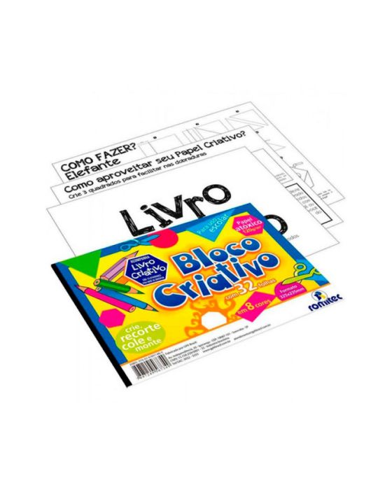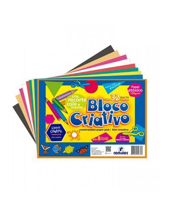 Caracteristicas:O Bloco criativo ROMITEC é um livro pedagógico com atividades como colagem, dobradura e recorte, pode ser usado em atividade escolar e como entretenimento. Além do livro, o produto acompanha 32 folhas coloridas, 8 cores vibrantes, produto 100% reciclável e atóxico.- Formato: 235 x 325mm- Gramatura: 120g/m2- 8 cores- Papel atóxico * As especificações podem ser alteradas sem aviso prévio ** Imagem meramente ilustrativa.