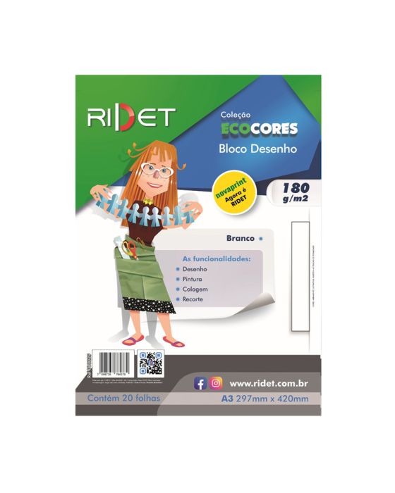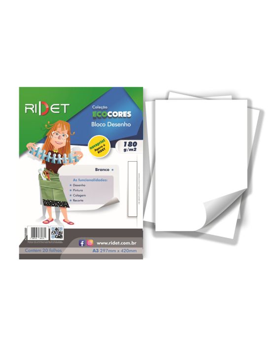 Caracteristicas:Desperte sua imaginação com o Bloco desenho da Ridet.Com gramatura de 180g/m2, este bloco de desenho é ideal para desenho, pinturas, colagens e recortes, permitindo que seja explorado ao máximo a criatividade! Crie trabalhos impressionantes e dê vida a suas ideias com o papel colorido da Ridet, sua ferramenta versátil para expressão criativa.Detalhes:- Marca: Ridet;- Modelo: Ecocores;- Referência: 100029;- Linha: Bloco desenho;- Cor: Branco;- Quantidade folhas: 20 folhas;- Contém: 1 embalagem com 20 folhas do produto;- Formato: A3;- Tamanho: 297 x 420mm (29,7 x 42cm);- Gramatura: 180g/m2;- Diversas funcionalidades.Industria Brasileira | Validade indeterminada.Ideal para:- Ideal para desenhos, pintura, colagem e recorte.Composição:- Papel 100% Fibra celulósica.Conservação:- Armazenar em local seco sem umidade.Medidas:- Dimensões do produto: 297 x 420mm (29,7 x 42cm);- Dimensões da embalagem: 29,7 x 42,1 x 0,6cm (LxCxA).- Peso: 157g.* As especificações podem ser alteradas sem aviso prévio ** Imagem meramente ilustrativa ***Cores sujeito a alteração de tonalidade.