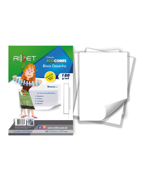 Caracteristicas:Desperte sua imaginação com o Bloco desenho da Ridet.Com gramatura de 180g/m2, este bloco de desenho é ideal para desenho, pinturas, colagens e recortes, permitindo que seja explorado ao máximo a criatividade! Crie trabalhos impressionantes e dê vida a suas ideias com o papel colorido da Ridet, sua ferramenta versátil para expressão criativa.Detalhes:- Marca: Ridet;- Modelo: Ecocores;- Referência: 100028;- Linha: Bloco desenho;- Cor: Branco;- Quantidade folhas: 20 folhas;- Contém: 1 embalagem com 20 folhas do produto;- Formato: A4;- Tamanho: 210 x 297mm (21 x 29,7cm);- Gramatura: 180g/m2;- Diversas funcionalidades.Industria Brasileira | Validade indeterminada.Ideal para:- Ideal para desenhos, pintura, colagem e recorte.Composição:- Papel 100% Fibra celulósica.Conservação:- Armazenar em local seco sem umidade.Medidas:- Dimensões do produto: 210 x 297mm (21 x 29,7cm);- Dimensões da embalagem: 21 x 29,7 x 0,6cm (LxCxA).- Peso: 157g.* As especificações podem ser alteradas sem aviso prévio ** Imagem meramente ilustrativa ***Cores sujeito a alteração de tonalidade.