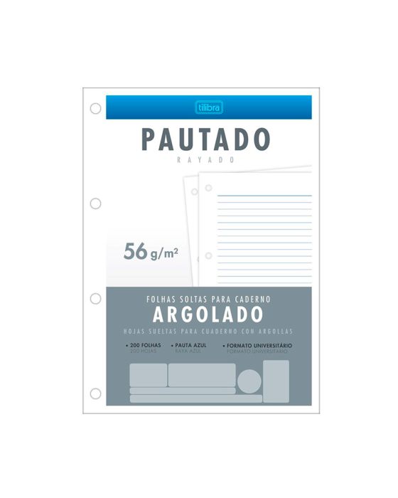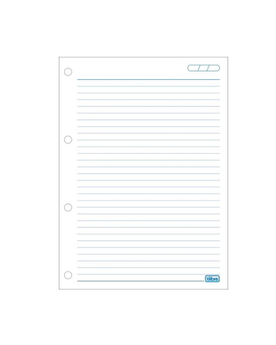 Caracteristicas:O Refil para Caderno Argolado Universitário Folhas Soltas Académie 200 Folhas possui folhas pautadas. Ideal para o dia a dia na escola ou na faculdade!Detalhes:- Marca: Tilibra.- Modelo: Académie.- Referência: 709012- Linha: Folhas soltas para caderno argolado.- Capa flexível.- Quantidade: 200 folhas.- Contém: 1 embalagem com 200 folhas.- Formato: 200 x 275mm (20 x 27,5cm).- Gramatura: 56 g/m².- Furos: 4 furos.- Folhas pautadas azul.- Miolo.- Produto certificado FSC.Espaçamento Furos:- Espaçamento de 7,2cm entre os furos:* As especificações podem ser alteradas sem aviso prévio ** Imagem meramente ilustrativa.