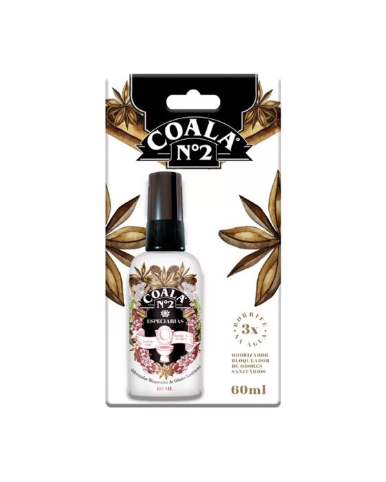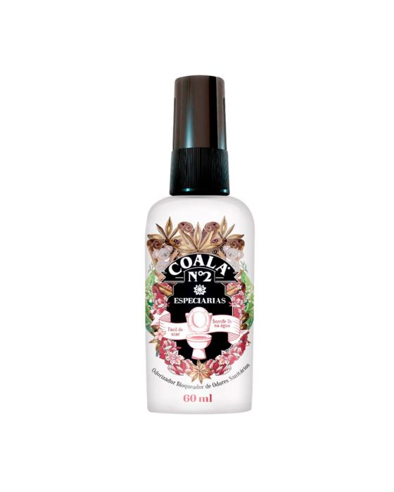 Características:Coala Nº2 é um bloqueador de odores sanitários que te ajuda naquele momento que é, muitas vezes, constrangedor: a hora do número dois.Ele cria uma barreira na água do vaso sanitário, que inibe a dissipação dos maus odores. Simples e prático, para acabar com qualquer constrangimento na hora de usar o banheiro.Detalhes:- Marca: Coala;- Modelo: N°2;- Linha: Bloqueador de odores;- Tipo: Spray;- Fragrância: Especiarias;- Volume: 60ml;- Contém: 1 blister com uma unidade do produto;- Simples e prático,- Ideal para carregar na bolsa.Indústria Brasileira. | Validade: 24 meses após a data de fabricação.Ideal para: - Indicado para bloquear odores quando utilizar o vaso sanitário.Modo de uso:- Posicione o bico da embalagem na altura da tampa do sanitário com o borrifador na direção da água do vaso;- Borrife 3 vezes antes de utilizar o sanitário e o mau cheiro não aparecerá.Conservação:- Conserve o produto fechado, em local fresco e ventilado. Composição:- Fragrância, Emulsificante, Solvente, Conservante e Ativo.Medidas:- Dimensões da embalagem (considerando o produto deitado): 20,5 x 10,3 x 2,4cm (CxLxA);- Peso: 269g.CONSERVE FORA DO ALCANCE DE CRIANÇAS E DOS ANIMAIS DOMESTICOS.* As especificações podem ser alteradas sem aviso prévio ** Imagem meramente ilustrativa.