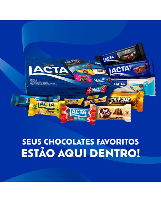 Caracteristicas:Tenha os melhores chocolates da marca Lacta por perto com a caixa de bombom Lacta Favoritos com um mix surpreendente com sabores icônicos da marca que combina qualidade e diversidade para agradar a todos os gostos!Presenteie com a caixa de bombom Lacta Favoritos em qualquer época do ano os seus amigos e familiares!Detalhes:- Marca: Lacta- Fabricante: Mondelez- Modelo: Favoritos- Peso: 250,6g- Sabores: Amandita, Lacta Ao Leite, Bis, Bis Black, Bis Branco, Bis Oreo, Diamante Negro, Lacta Coco, Lacta Morango, Laka, Laka Oreo, Ouro Branco, Ouro Branco Duo Nuts, Shot, Sonho de Valsa e 5star. Dimensões da embalagem:- Tamanho: 7,3 x 19,1 x 9,6 (AxLxP)ALÉRGICOS: Contém derivados de leite e de soja.* Pode conter amendôa, cevada, castanha-de-caju, avelã, amendoim, trigo e latex natural.** Contém Lactose. Contém Glúten.- Mantenha em local fresco, seco, inodoro evitando sol, calor e umidade. * As especificações podem ser alteradas sem aviso prévio ** Imagem meramente ilustrativa.