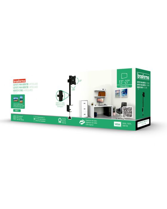 CaraterísticasO suporte de monitor BM811 é ideal fixação de monitores. Suporte versátil, possui gerenciador de cabos, permite ajuste de altura do monitor, não necessita furar a mesa – fixação por morsa, suporta até 8kg e sua pintura é eletrostática para maior durabilidade e resistência. Produzido em aço carbono e permite modo retrato ou paisagem.- Atende a NR 17 (Ergonomia)- Não é necessário furar a mesa – Fixação através de morsa- Permite ajuste de altura do monitor- Fácil instalação e organização dos cabos- Permite deixar a tela em modo Retrato ou PaisagemInformações adicionais- Tipo: Inclinação e rotação- Polegadas: de 13 a 27- Inclinação: 45°- Articulação: 90° + Rotação de 360°- Local de instalação: Mesa- Furação VESA: 75 x 75mm e 100 x 100mm- Capacidade de carga: 8kg- Material: Aço carbono e plástico- Comprimento: 41,5cm- Peso: 2kg- Cor: Preto- Conteúdo da embalagem: 1 Suporte BM811, Kit parafusos, 1 manual de instruções- Garantia: 3 anos de garantia contra defeitos de fabricação através do suporte Brasforma (11) 2246-0222 ou [email protected]Observações:- Verifique se a superfície de instalação apresenta resistência suficiente para uma instalação segura.- Fique atento a carga máxima indicada para o suporte.- Aconselhamos que a instalação seja realizada por um profissional da área.* As especificações podem ser alteradas sem aviso prévio ** Imagem meramente ilustrativa.