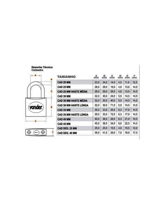 Características:Os Cadeados Vonder são feitos com material resistente, e são ideais para armários, bolsas, malas, quadro de força, portões industriais, acesso ao registro de luz, etc - Marca: Vonder - Medida: E-25mm - Corpo em latão maciço com haste em aço - Acompanha 2 chaves em latão - 4 pinos - Autoblocável com travas oblíquas - Ideal para armários, malas, etc- Largura do corpo do cadeado:25,0 mm - Altura do corpo do cadeado:24,8 mm - Diâmetro da haste do cadeado:4,0 mm * As especificações podem ser alteradas sem aviso prévio ** Imagem meramente ilustrativa.