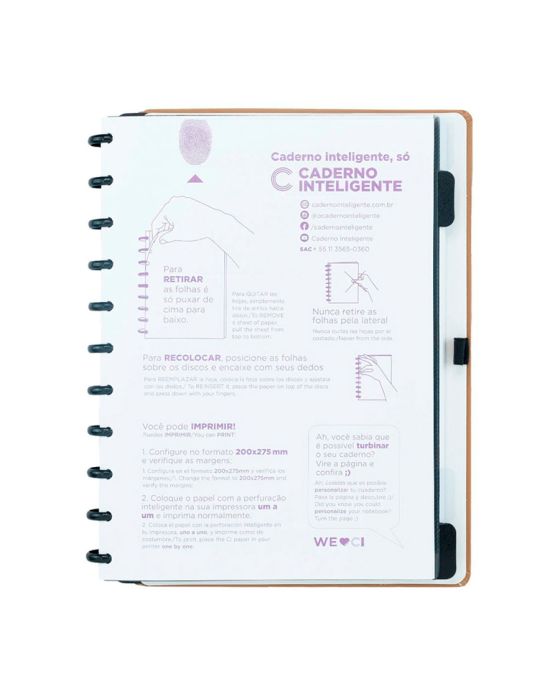 Características:Se você precisa de um material para organizar melhor a sua rotina, a Caderno Inteligente® tem a solução! O caderno infinito Caramel é perfeito para anotar tudo o que você precisa e não esquecer de nada - reuniões, tarefas, entregas e compromissos, absolutamente tudo!Por causa da praticidade do caderno de discos, você pode levar no seu CI só as páginas necessárias, economizando peso e espaço na bolsa.Caderno inteligente, só Caderno inteligente ;)Detalhes:- Marca: Caderno Inteligente;- Modelo: Caramel;- Referência: CIGD4092;- Linha: Cadernos;- Cor: Marrom com detalhes em preto*;- Quantidade folhas: 80 folhas (60 pautadas e 20 lisas);- Capacidade de folhas: Até 140 folhas;- Contém: 1 unidade do produto;- Tamanho: 288mm X 217mm (28,8 x 21,7cm);- Gramatura: 90g/m2**;- Fechamento: em elástico na cor preta;- Produto customizável, permitindo adicionar alças ou trocar os discos pela cor que preferir;- Produto atóxico;- Produto original.Indústria Brasileira. | Validade: Indeterminada.Acompanha:- Capa e contracapa rígidas;- 01 bolsa plástica; - 01 folha de instrução de uso e manuseio, com refis e acessórios da marca disponíveis no verso;- 01 folha de identificação com calendário no verso;- 04 divisórias com abas para identificação (02 pretas e 02 transparentes);- 80 folhas offset 90g (60 folhas pautadas e 20 folhas lisas brancas para impressão);- 01 suporte com elástico para 01 caneta ou 01 lápis e discos M + elástico.Instruções de manuseio:- Segure a folha com os dedos próximos aos discos e puxe-a suavemente de cima para baixo;- Nunca puxe as folhas pela lateral, isso pode danificá-las e prejudicar o encaixe posterior;- Para recolocar uma folha, posicione-a sobre os discos e encaixe-a pressionando com os dedos;- Cada tamanho de disco comporta uma quantidade máxima de itens. Respeite esse limite para não ter problemas com folhas “se soltando”.Composição:- Tecido, Celulose, ABS, PP, Látex, Poliéster e Aço.Medidas:- Dimensões do produto: 28,8 x 22,5 x 2,3cm (CxLxA);- Peso: 551g.* Por se tratar de um produto artesanal, a tonalidade pode variar;** Considerando produtos e refis da marca Caderno Inteligente.ATENÇÃO! NÃO RECOMENDÁVEL PARA CRIANÇAS DE ATÉ 3 (TRÊS) ANOS POR CONTER PARTE(S) PEQUENA(S) QUE PODEM SER ENGOLIDA(S) OU ASPIRADA(S). * As especificações podem ser alteradas sem aviso prévio ** Imagem meramente ilustrativa.