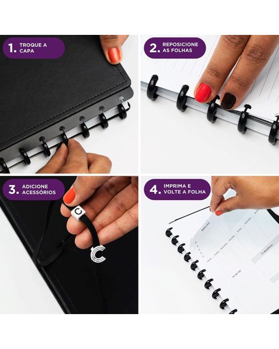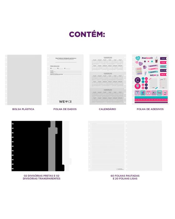 Características:A beleza da cor Guava com a elegância do prateado, desenvolvido e calculado a partir de muitas pesquisas! O caderno infinito Guava é perfeito para anotar tudo o que você precisa e não esquecer de nada - reuniões, tarefas, entregas e compromissos, absolutamente tudo!Por causa da praticidade do caderno de discos, você pode levar no seu CI só as páginas necessárias, economizando peso e espaço na bolsa.Caderno inteligente, só Caderno inteligente ;)Detalhes:- Marca: Caderno Inteligente;- Modelo: Guava;- Referência: CIMD3339;- Linha: Cadernos;- Tipo: Médio;- Cor: Rosa velho com detalhes em branco e prata*;- Quantidade folhas: 80 folhas (60 pautadas e 20 lisas);- Capacidade de folhas: Até 140 folhas;- Contém: 1 unidade do produto;- Tamanho: 23mm X 175mm (23 x 17,5cm);- Gramatura: 90g/m2**;- Fechamento: em elástico na cor rosa velho;- Possui uma folha de adesivos decorativos;- Produto customizável, permitindo adicionar alças ou trocar os discos pela cor que preferir;- Produto atóxico;- Produto original.Indústria Brasileira. | Validade: Indeterminada.Acompanha:- Capa e contracapa rígidas;- 01 folha de adesivos;- 01 bolsa plástica;- 01 folha de instrução de uso e manuseio, com refis e acessórios da marca disponíveis no verso;- 01 folha de identificação com calendário no verso;- 04 divisórias com abas para identificação (02 pretas e 02 transparentes);- 80 folhas offset 90g (60 folhas pautadas e 20 folhas lisas brancas para impressão);- 01 suporte com elástico para 01 caneta ou 01 lápis e discos M + elástico.Instruções de manuseio:- Segure a folha com os dedos próximos aos discos e puxe-a suavemente de cima para baixo;- Nunca puxe as folhas pela lateral, isso pode danificá-las e prejudicar o encaixe posterior;- Para recolocar uma folha, posicione-a sobre os discos e encaixe-a pressionando com os dedos;- Cada tamanho de disco comporta uma quantidade máxima de itens. Respeite esse limite para não ter problemas com folhas “se soltando”.Composição:- Tecido, Celulose, ABS, PP, Látex, Poliéster e Aço.Medidas:- Dimensões do produto: 25,5 x 20,2 x 2,1cm (CxLxA);- Peso: 551g.* Por se tratar de um produto artesanal, a tonalidade pode variar;** Considerando produtos e refis da marca Caderno Inteligente.ATENÇÃO! NÃO RECOMENDÁVEL PARA CRIANÇAS DE ATÉ 3 (TRÊS) ANOS POR CONTER PARTE(S) PEQUENA(S) QUE PODEM SER ENGOLIDA(S) OU ASPIRADA(S). * As especificações podem ser alteradas sem aviso prévio ** Imagem meramente ilustrativa.