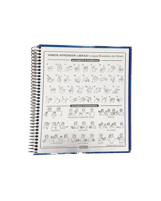 Caracteristicas:- Capa dura- 10 matérias- 160 folhas - Formato: 200 x 275mm- Gramatura: 56g/m2- Bolsa de papel dupla- Pauta cinza- Divisor de matérias personalizado- Contra capa com alfabeto e expressões em libras* As especificações podem ser alteradas sem aviso prévio ** Imagem meramente ilustrativa