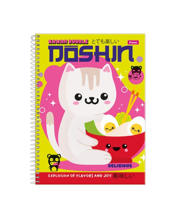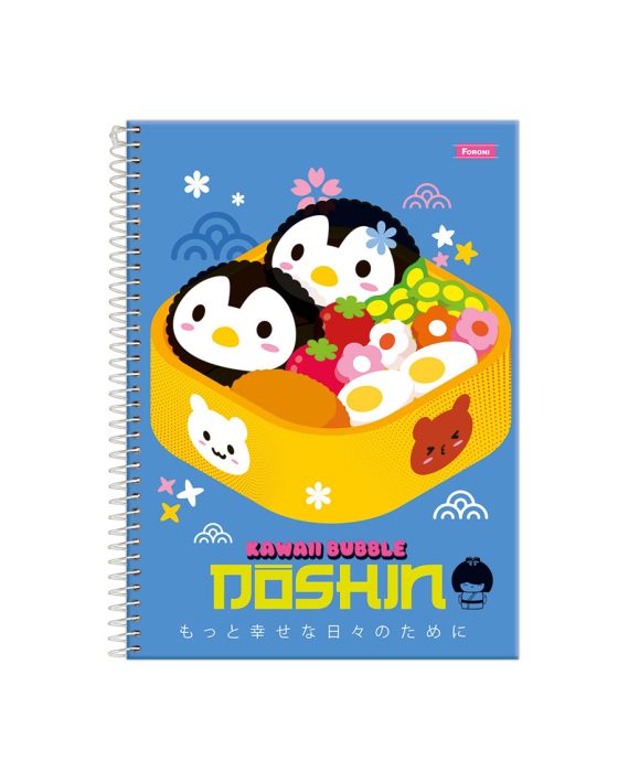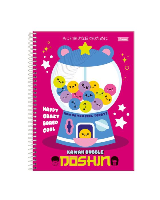 Características:O Caderno Universitário Capa Dura Doshin foi inspirado no movimento kawaii, fenômeno cultural originado no Japão e que está se tornando ainda mais popular no Brasil.Detalhes:- Marca: Foroni;- Modelo: Noshin;- Referência: 3169145;- Linha: Cadernos Espiral;- Tipo: Universitário;- Capa: Capa dura com laminação fosca e Super Hot Stamping (Estampas sortidas);- Contra capa: Contra capa decorada;- Quantidade de folhas: 80 folhas;- Quantidade de matérias: 1 matéria;- Contém: 1 unidade do produto com 80 folhas;- Formato: 200 x 275mm (20 x 27,5cm);- Gramatura: 56g/m2;- Espiral: Branca;- Folhas: pautadas cinza decorada;- Possui bolsa plástica transparente;- Possui uma cartela de adesivos funcionais;- Índice/separador de matérias decorado;- Miolo;- Produto certificado: FSC.Composição:- Capa: Papelão e Papel Couché;- Folhas Internas: Papel Offset 56g/m2.Medidas:- Dimensões do produto: 200 x 275mm (20 x 27,5cm);- Gramatura: 56g/m2.Estampas sortidas, será enviado de acordo com a disponibilidade do estoque. Não é possível escolher uma estampa específica.* As especificações podem ser alteradas sem aviso prévio ** Imagem meramente ilustrativa.