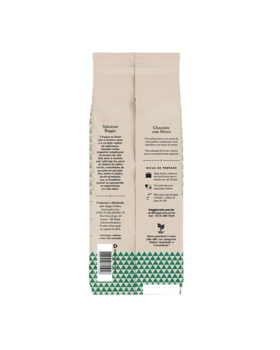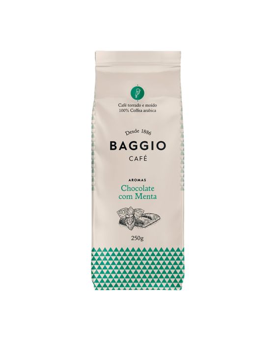 Características:Se você é fã de café com um toque de frescor, o café aromatizado Chocolate com Menta, com notas de chocolate ao leite e menta, pode ser uma excelente opção.Este café apresenta um sabor doce e fresco, com uma intensidade média e uma baixa acidez que realça seu corpo prolongado, oferecendo uma experiência sensorial única e deliciosa.Detalhes:- Marca: Baggio Cafés;- Linha: Cafés;- Sabor: Chocolate com Menta;- Tipo: Moído;- Peso: 250g;- Itensidade: 07;- Origem: Mogiana Paulista e sul de Minas Gerais;- Contém: 1 unidade do produto;- Compatibilidade: Ideal para metódos de preparo com cafés torrados e moídos, como cafeteira italiana, filtros, prensa francesa, aeropress, espressos, coados, entre outros;- Experiência sensorial única e agradável;- Tipo de grão: 100% Arábica.Corpo: - Aroma: Chocolate com Menta;- Notas: Menta e chocolate ao leite;- Harmoniza com: Bebida lácteas e cappuccinos;- Moagem: Média;- Torra: Média;- Bebida: Mole.Dicas de preparo:- Após aberto, conservar em local fresco, seco e arejado por até 30 dias;- Uso indicado para máquinas e filtros;- Para cada copo de água (150ml), 1 colher de sopa de café.Ingredientes:- Café torrado moído e aromatizantes.ALÉRGICOS: NÃO CONTÉM LACTOSE. NÃO CONTÉM GLÚTEN. NÃO CONTÉM AÇÚCAR. NÃO CONTÉM LEITE E DERIVADOS. * As especificações podem ser alteradas sem aviso prévio ** Imagem meramente ilustrativa.