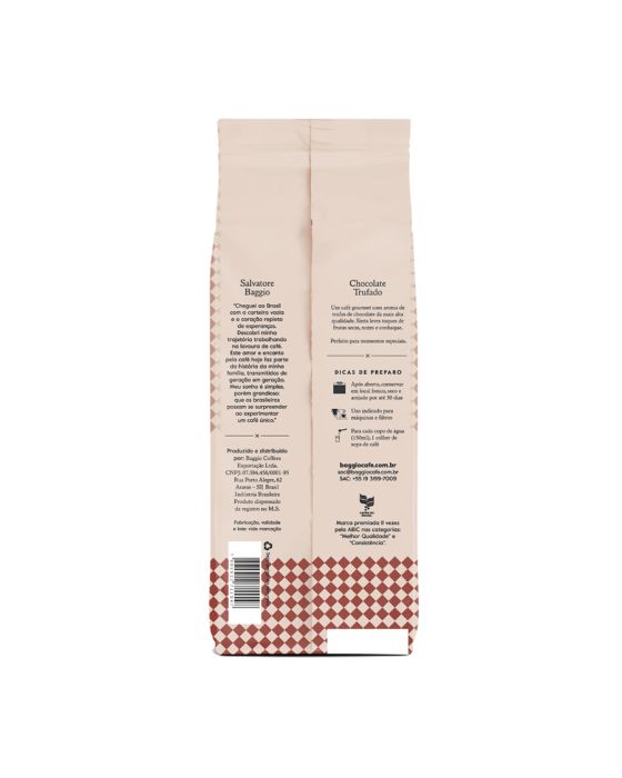 Características:O café aromatizado Chocolate Trufado proporciona uma experiência sensorial única e agradável com seu sabor doce, intensidade média, e textura encorpada e aveludada.Ao experimentar o Baggio Chocolate Trufado , você sentirá um aroma delicioso de chocolate ao leite que complementa perfeitamente o sabor delicado da bebida. As notas de trufa de chocolate adicionam um toque extra de aroma e cremosidade que tornam este café ainda mais especial.Detalhes:- Marca: Baggio Cafés;- Linha: Cafés;- Sabor: Chocolate Trufado;- Tipo: Moído;- Peso: 250g;- Itensidade: 07;- Origem: Mogiana Paulista e sul de Minas Gerais;- Contém: 1 unidade do produto;- Compatibilidade: Ideal para metódos de preparo com cafés torrados e moídos, como cafeteira italiana, filtros, prensa francesa, aeropress, espressos, coados, entre outros;- Experiência sensorial única e agradável;- Tipo de grão: 100% Arábica.Corpo: - Aroma: Chocolate Trufado;- Notas: Frutas vermelhas secas;- Harmoniza com: Bebida lácteas e cappuccinos;- Moagem: Média;- Torra: Média;- Bebida: Mole.Dicas de preparo:- Após aberto, conservar em local fresco, seco e arejado por até 30 dias;- Uso indicado para máquinas e filtros;- Para cada copo de água (150ml), 1 colher de sopa de café.Ingredientes:- Café torrado moído e aromatizantes.ALÉRGICOS: NÃO CONTÉM LACTOSE. NÃO CONTÉM GLÚTEN. NÃO CONTÉM AÇÚCAR. NÃO CONTÉM LEITE E DERIVADOS. * As especificações podem ser alteradas sem aviso prévio ** Imagem meramente ilustrativa.