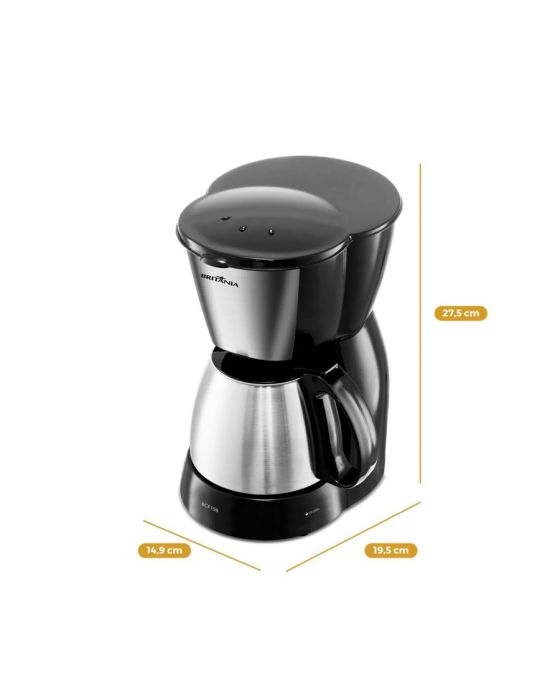 Características:Nada melhor que começar o dia com um café quentinho, não é mesmo? Para isso, conte com a Cafeteira Britânia 18 Cafezinhos BCF19B Jarra de Inox 550W! Com jarra em inox que, além de embelezar sua cozinha, é mais resistente e sofisticada. O inox ainda ajuda a manter a temperatura do café por maior tempo. A base de aquecimento deixa o café quentinho mesmo depois de ter terminado de passar. E, para maior facilidade, a jarra pode ser levada à mesa. Ideal para qualquer hora do dia, a Cafeteira Britânia BCF19B prepara até 18 cafezinhos, de forma rápida e eficiente. Afinal, são 550W de potência. Além disso, conta com porta-filtro removível, para uma limpeza ainda mais prática e descomplicada. Para mais facilidade, a Cafeteira Britânia BCF19B possui sistema corta-pingo que permite a retirada da jarra da cafeteira antes do término do preparo, evitando respingos e bagunça no seu ambiente. Em qualquer momento do dia, Britanie seu café com a Cafeteira Britânia 18 Cafezinhos BCF19B Jarra Inox 550W!Detalhes:- Marca: Britânia;- Modelo: BCF19B;- Linha: Cafeteiras;- Cor: Preto/Inox;- Tensão: 220V;- Potência 550W;- Capacidade do reservatório: 720ml;- Contém: 1 unidade do produto;- Capacidade para 18 cafezinhos;- Acompanha colher dosadora;- Acabamento em inox;- Filtro e porta filtro removíveis facilitando a limpeza;- Placa de aquecimento, mantém o café aquecido após o preparo;- Botão luminoso liga/desliga.Benefícios:- 18 Cafezinhos Ideal para aquele cafezinho a qualquer hora do dia;- Jarra de Inox: Além de ser mais resistente e dar um charme especial, pode ser levada à mesa;- Sistema corta-pingos: Permite a retirada da jarra enquanto o café está sendo preparado;- 550W de potência: Proporciona um preparo rápido e eficiente;- Porta filtro removível: Mais prático, garante uma limpeza descomplicada;- Placa de aquecimento: Mantém o café aquecido após o preparo, sem alterar o sabor.Energia:- Tensão: 220V;- Potência: 550W;- Consumo (kW/h): 0,55 kW/h.Composição:- Fabricado em plástico e metal.Medidas:- Dimensões do produto: 19,5 x 17 x 27,5cm (CxLxA);- Dimensões da embalagem: 22 x 15,7 x 28cm (CxLxA);- Peso do produto: 0,970kg;- Peso da embalagem: 1,16kg.Conteúdo da embalagem: 1 Cafeteira 18 Cafezinhos BCF19B 550W Britânia e 1 Manual de Instruções.Garantia do fornecedor: 1 ano contra defeitos de fabricação.* As especificações podem ser alteradas sem aviso prévio ** Imagem meramente ilustrativa.