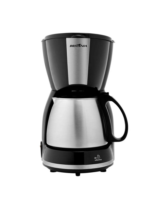 Características:A Cafeteira Britânia Inox 30 Temp é ideal para aqueles que são amantes de café! Pois conta com capacidade para 30 cafezinhos. Tem filtro permanente e porta-filtro removível, o que traz muito mais praticidade para o seu dia a dia, pois dispensa o uso de filtro de papel.Sua jarra em metal com capacidade para 1,2L e sua base de aquecimento, ajudarão a conservar seu café quentinho. Você nem precisa esperar o café terminar de passar, porque o sistema corta-pingo permite que você retire a jarra enquanto o café está sendo preparado.Para sua segurança, conta com base antiderrapante e acompanha colher dosadora para a dosagem exata do café. A sua cozinha ou copa precisa e você merece a Cafeteira Britânia Inox 30 Temp!Detalhes:- Marca: Britânia;- Modelo: Cafeteira Inox 30 Temp;- Linha: Cafeteiras;- Cor: Preto/Inox;- Tensão: 127V;- Potência 800W;- Capacidade do reservatório: 1,2L;- Contém: 1 unidade do produto;- Capacidade para 30 cafezinhos;- Acompanha colher dosadora;- Acabamento em inox;- Filtro permanente e porta filtro removível;- Placa de aquecimento, mantém o café aquecido após o preparo;- Botão luminoso liga/desliga.Benefícios:- 30 Cafezinhos Ideal para aquele cafezinho a qualquer hora do dia;- Jarra de Inox: Além de ser mais resistente e dar um charme especial, pode ser levada à mesa;- Sistema corta-pingos: Permite a retirada da jarra enquanto o café está sendo preparado;- 800W de potência: Proporciona um preparo rápido e eficiente;- Porta filtro removível: Mais prático, garante uma limpeza descomplicada;- Placa de aquecimento: Mantém o café aquecido após o preparo, sem alterar o sabor.Energia:- Tensão: 127V;- Potência: 800W;- Consumo (kW/h): 0,8 kW/h;- Tamanho Cordão: 75cm;- Tomada (A): 10A (127V);- Pinos (2 ou 3): 3 pinos.Composição:- Fabricado em plástico e metal.Medidas:- Dimensões do produto: 22,3 x 21 x 30,7cm (CxLxA);- Dimensões da embalagem: 25,2 x 19,2 x 31,9cm (CxLxA);- Peso do produto: 1,33kg;- Peso da embalagem: 1,61kg.Conteúdo da embalagem: 1 Cafeteira Inox 30 Temp Britânia e 1 Manual de Instruções.Garantia do fornecedor: 1 ano contra defeitos de fabricação.* As especificações podem ser alteradas sem aviso prévio ** Imagem meramente ilustrativa.