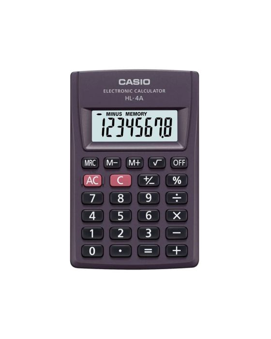 Características:A linha de calculadoras Casio facilita o seu dia a dia em casa, no trabalho e na faculdade. Fáceis de usar e prática para levar em qualquer lugar. Precisas e seguras, as calculadoras básicas Casio estão desenhadas para donas de casa, estudantes e profissionais. Essa calculadora conta com as funções das 4 operações, raiz quadrada e teclas % e +/-. De fácil uso e desenhada para adaptar-se aos seus desafios, a HL-4A se encarrega dos cálculos.Detalhes:- Marca: CASIO;- Modelo: HL-4A;- Linha: Calculadoras de bolso;- Cor: Preta;- Contém: 1 unidade do produto;- Visor: 8 Dígitos;- Tecnologia Japonesa;- Mostrador Grande;- Alimentação dupla inteligente.Gerais:- Tipo de produto: Tipo portátil;- Número de dígitos: 8 dígitos;- Visor de cristal líquido: Visor grande;- Função das teclas: Troca de sinal (+/-).Funções de cálculo:- Cálculo básico;- Percentual básico (%);- Raiz quadrada (v).Alimentação de energia- LR54×1 (Duração aproximada da pilha principal de 6.500 horas).Memória:- Independente.Medidas:- Dimensões do produto: 8,7 x 5,7 x 0,6cm (CxLxA);- Peso: 25g.Garantia do fornecedor: 1 ano contra defeitos de fabricação.* As especificações podem ser alteradas sem aviso prévio ** Imagem meramente ilustrativa