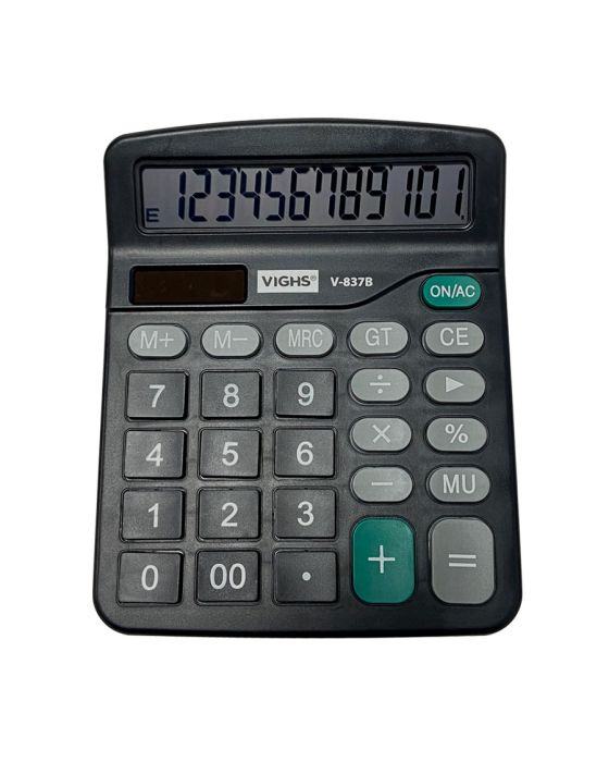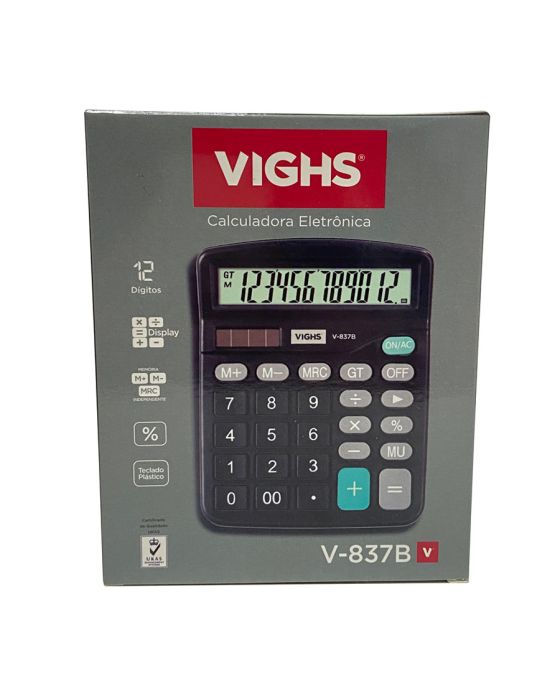 Características:A calculadora V837B da Vighs funciona através de uma pilha AA. Este produto é para ser utilizado em cima de uma mesa, seu visor LCD é inclinado justamente para ter a melhor visualização possível enquanto estiver sentado.Detalhes:- Marca: Vighs;- Modelo: V-837B;- Linha: Calculadoras;- Tipo: De mesa;- Cor: Preto;- Visor: Uma linha;- Contém: 1 unidade do produto;- Dígitos: 12 dígitos;- Visor inclinado;- Cálculos estatísticos;- Memória independente;- Teclado plástico;- Porcentagem.Fabricado na China. | Validade: Indeterminada.Alimentação de energia:- Alimentação: AAAx1 (R03);- Energia Solar.Composição:- Plástico e componentes eletrônicos em metal.Medidas:- Dimensões do produto: 15 x 11,7 x 3,9cm (CxLxA);- Dimensões da embalagem: 15 x 12 x 3,9cm (CxLxA);- Peso: 141g.Garantia do fornecedor: 3 anos contra defeitos de fabricação.* As especificações podem ser alteradas sem aviso prévio ** Imagem meramente ilustrativa.