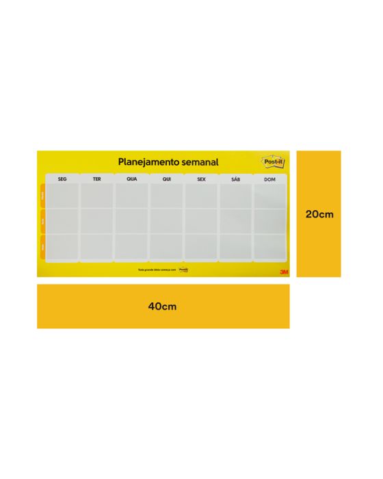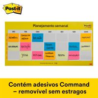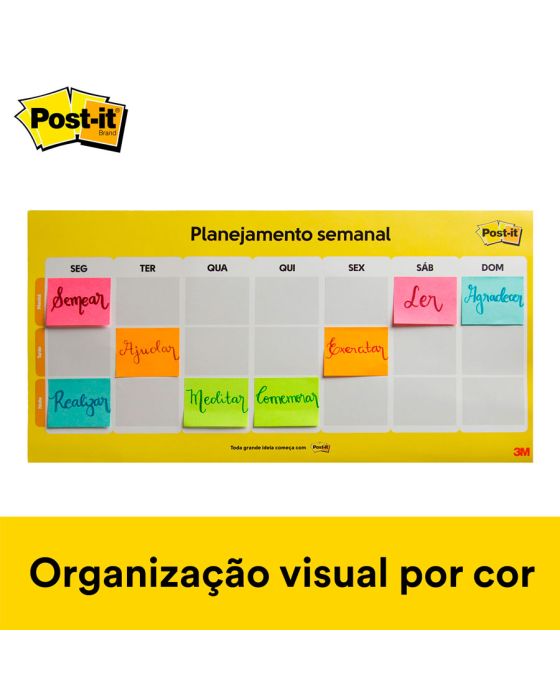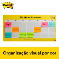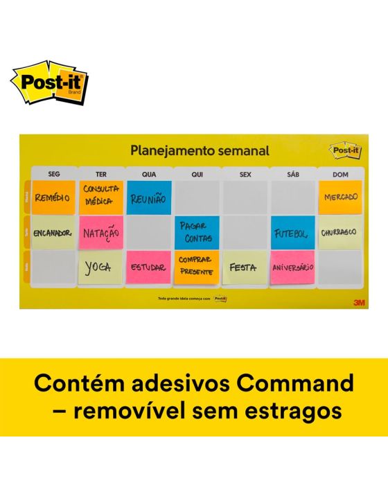 Características:Liberte as suas ideias com Post-it®. Sabia que é mais provável que as coisas se tornem realidade quando você as escreve à mão? Então escreva seus objetivos, seus sonhos, as coisas que você tem que fazer e lembrar, em um Post-it® Sticky Note.As Notas Post-it® Super Sticky têm 2 vezes mais aderência do que as Notas Post-it® Originais. Use-o para notas ou lembretes em portas, janelas ou paredes. Seu adesivo permite que ele cole de forma confiável uma e outra vez para que sua mensagem permaneça onde precisa estar.Detalhes:- Marca: Post-it®;- Fabricante: 3M™;- Modelo: Post-it® Super Sticky;- Referência: HB004605661;- Linha: Planejadores Semanais;- Cor: Amarelo/Branco;- Contém: 1 unidade do produto;- 2 blocos de notas adesivas 50 mm x 38 mm cores sortidas- 2 tiras adesivas médias Command®.- Separe uma cor de Notas Adesivas Post-it® para cada tipo de atividade. Assim, fica mais fácil e visual de identificar;- Facilita e ajuda você em suas atividades e organização;- Acompanha dois blocos de notas adesivos Post-it®;- O papel para notas Post-it® vem de florestas certificadas, renováveis ??e geridas de forma responsável.Aplicação:- Ótimos para deixar seus recados e lembretes sempre ao seu alcance.Medidas:- 400 x 200mm (40 x 20cm) (CxL).