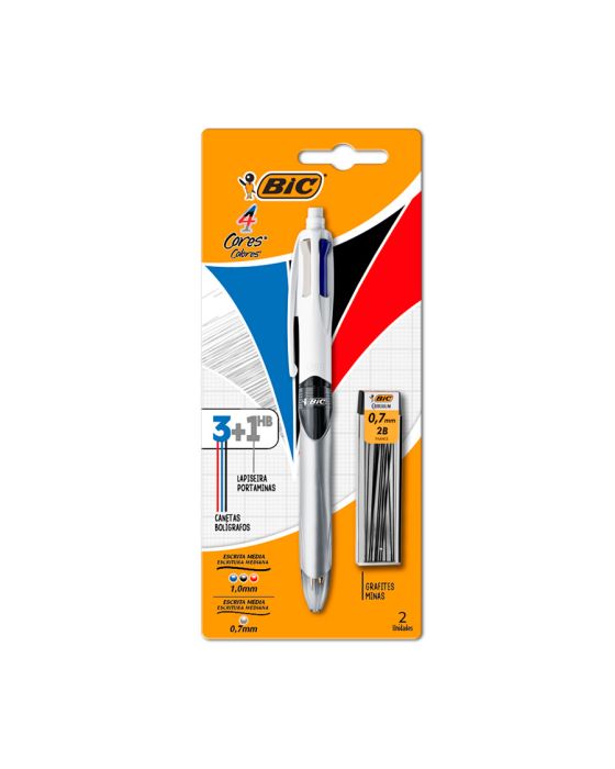 Características:Seu desejo foi atendido: agora uma caneta esferográfica 4 em 1 que vem com 3 tintas de cores diferentes e uma lapiseira embutida.Cores clássicas: azul, preta e vermelha mais um grafite HB 0,7mm, tudo ao seu alcance com um único clique, além de possuir borracha branca com tampa na extremidade.Detalhes:- Marca: BIC;- Modelo: 3 cores 3 em 1;- Referência: 9309778;- Linha: Caneta Esferográfica;- Cores da tinta: Azul, Cinza, Vermelha e Preto;- Cor do corpo: Branco e detalhes em preto e cinza;- Ponta caneta: Média 1,0mm;- Ponta grafite: Média 0.7mm;- Contém: 1 blister com 1 unidade do produto;- 4 em 1: 3 cores de canetas e 1 lapiseira portaminas;- Acompanha: 1 estojo de minas de grafite 0.7mm.- Possui borracha branca da ponta.Fabricado no Japão. | Validade: Indeterminada.Composição:- Caneta: Resinas termoplásticas, Tinta à base de corantes orgânicos e solventes, ponta de latão, esfera de tungstênio e componentes metálicos;- Lapiseira: Grafite e minas.Medidas:- Dimensões do produto: 15,2 x 1,6 x 1,5cm (CxLxA);- Dimensões da embalagem: 19,5 x 8 x 1cm (CxLxA);- Peso: 100g.ATENÇÃO! NÃO RECOMENDÁVEL PARA CRIANÇAS DE ATÉ 3 (TRÊS) ANOS POR CONTER PARTE(S) PEQUENA(S) QUE PODEM SER ENGOLIDA(S) OU ASPIRADA(S). CRIANÇAS DE ATÉ 8 ANOS DEVEM UTILIZAR SOB SUPERVISÃO DE UM ADULTO POR CONTER PONTA(S) AGUDA(S) FUNCIONAL(IS).* As especificações podem ser alteradas sem aviso prévio ** Imagem meramente ilustrativa.