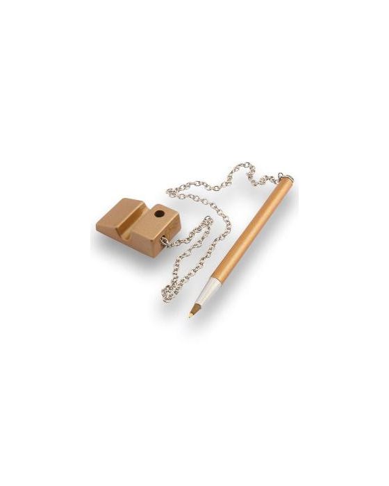 Caracteristicas: - Caneta em alumínio tubolar, - Cor da Caneta e Suporte: Dourado - com suporte para repouso na Horizontal - acabamento em pintura metálica, - corrente de 50 cm e fixação fita adesiva dupla face - Fácil aplicação - Marca : Caneta Fixa - Fabricante: Fejova - Carga Bic* ou similar. Fácil aplicação/troca. * As especificações podem ser alteradas sem aviso prévio ** Imagem meramente ilustrativa.