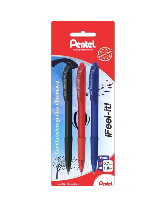 Caneta Esferografica Retratil Feel-it 0.7mm Bls C/3 Azul,preta, Vermelha Sm/bx417-abc Pentel