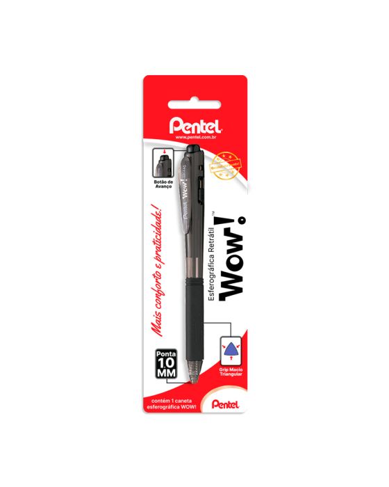 Características:Caneta retrátil com botão lateral, corpo triangular e grip emborrachado para melhor encaixe e conforto da mão. Escrita suave e cores vivas. Excelente custo x benefício!Detalhes:- Marca: Pentel;- Modelo: Wow!;- Referência: BK440-A;- Linha: Caneta Esferográfica;- Tipo: Retrátil;- Cor: Preta;- Cor da tinta: Preta;- Ponta: 1.0mm;- Contém: 1 blister com uma unidade do produto;- Grip emborrachado;- Retrátil com botão lateral.* As especificações podem ser alteradas sem aviso prévio** Imagem meramente ilustrativa.