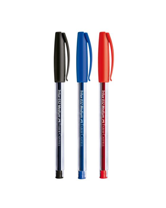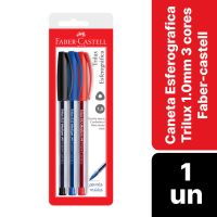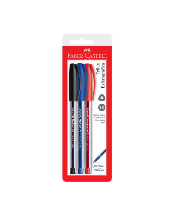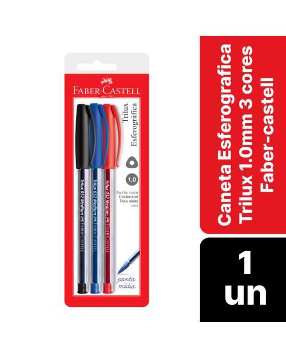 Características:As canetas esferográficas Trilux tem o formato triangular ergonômico, que garante conforto e melhor escrita. Sua ponta de 1.0mm proporciona uma escrita macia, sem falhas ou borrões.Detalhes:- Marca: Faber-Castell;- Modelo: Trilux;- Referência: SM/032;- Linha: Canetas Esferográficas;- Cor: Azul, Preta e Vermelha;- Ponta: 1,0mm;- Contém: 1 blister com 3 unidades do produto com cores mistas;- Formato: Triangular;- Maior precisão no traço;- Escrita macia, sem falhas ou borrões;- Tampa antiasfixiante;- Garantia de conforto e melhor escrita;- Dura muito mais.* As especificações podem ser alteradas sem aviso prévio ** Imagem meramente ilustrativa.
