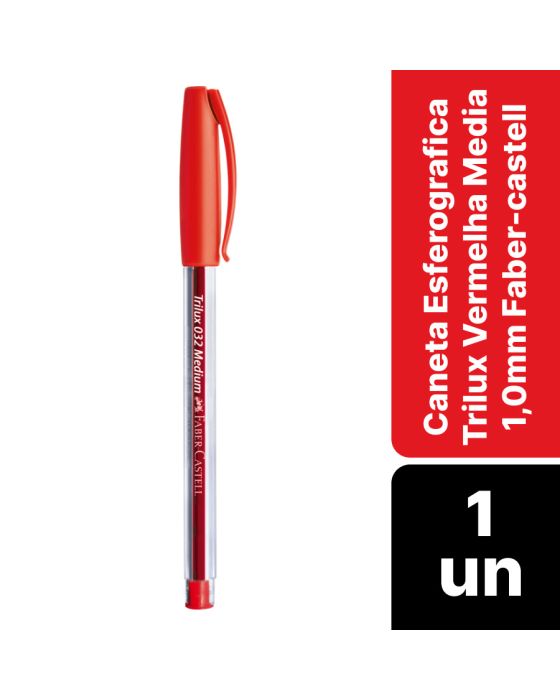 Características:As canetas esferográficas Trilux tem o formato triangular ergonômico, que garante conforto e melhor escrita. Sua ponta de 1.0mm proporciona uma escrita macia, sem falhas ou borrões.Detalhes:- Marca: Faber-Castell;- Modelo: Trilux;- Referência: 032/VM;- Linha: Canetas Esferográficas;- Cor do corpo: Transparente;- Cor da tinta: Vermelha;- Cor da tampa: Vermelha;- Ponta: 1,0mm;- Contém: 1 unidade do produto;- Formato: Triangular;- Maior precisão no traço;- Escrita macia, sem falhas ou borrões;- Tampa antiasfixiante;- Garantia de conforto e melhor escrita;- Dura muito mais.* As especificações podem ser alteradas sem aviso prévio ** Imagem meramente ilustrativa.