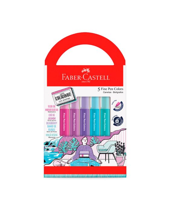 Características:Nova coleção de Fine Pen, agora com cheirinho!O estojo Relaxa & Reequilibra conta com 5 canetas, cada uma com um aroma exclusivo que une a criatividade com uma experiência sensorial única! São cheirinhos gostosos de sentir enquanto você faz as suas anotações e além de ter uma longa duração. Detalhes:- Marca: Faber-Castell;- Modelo: Fine Pen Relaxa e Reequilibra;- Referência: FPB/ES5RRZF;- Linha: Canetas;- Cores: Verde (Maça Verde), Azul (Banho de Flores), Roxo (Blueberry), Lilás (Chá de Jasmim), Rosa (Flor de Madressilva);- Formato: Triangular;- Contém: 1 blister com 5 unidades com cores mistas;- Ponta: Ultrafina 0.4mm;- Ideal para desenhar e escrever;- Ponta ultrafina com traço preciso;- Tinta que não passa para o outro lado da folha;- Produto atóxico.Indústria Brasileira | Validade: Indeterminada.Armazenamento:- Evitar temperaturas acima de 45°C e exposição direta aos raios solares;- Armazenar em local seco e ventilado;- Tampar após o uso.Composição: - Tinta: Veículo Aquoso, umectantes, corantes, aditivos e aroma;- Tampa e corpo: Resinas termoplásticas;- Ponta: Metal e resina termoplásticas;- Pavio: Fibra.Medidas:- Dimensões da embalagem: 18,3 x 10,4 x 1,7cm (CxLxA);- Peso: 0,180kg.ATENÇÃO! NÃO RECOMENDÁVEL PARA CRIANÇAS MENORES DE 3 (TRÊS) ANOS POR CONTER PARTE(S) PEQUENA(S) QUE PODE(M) SER ENGOLIDA(S) OU ASPIRADA(S) E PONTA(S) AGUDA(S) FUNCIONAL(IS). CRIANÇAS ENTRE 5 (CINCO) E 8 (OITO) ANOS SOMENTE DEVEM UTILIZAR SOBR SUPERVISÃO DE UM ADULTO.* Registro Inmetro: 009479/2024.* As especificações podem ser alteradas sem aviso prévio ** Imagem meramente ilustrativa.