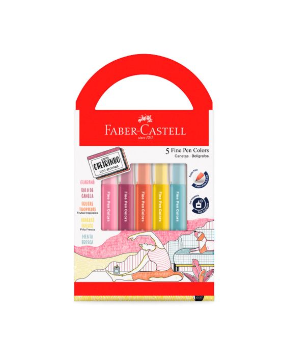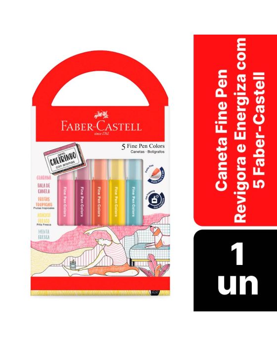 Características:Nova coleção de Fine Pen, agora com cheirinho!O estojo Revigora e Energiza conta com 5 canetas, cada uma com um aroma exclusivo que une a criatividade com uma experiência sensorial única! São cheirinhos gostosos de sentir enquanto você faz as suas anotações e além de ter uma longa duração.Detalhes:- Marca: Faber-Castell;- Modelo: Fine Pen Revigora e Energiza;- Referência: FPB/ES5REZF;- Linha: Canetas;- Cores: Verde (Menta Fresca), Amarelo (Abacaxi Fresco), Laranja (Frutas Tropicais), Roxo (Bala de Canela), Rosa (Guaraná);- Formato: Triangular;- Contém: 1 blister com 5 unidades com cores mistas;- Ponta: Ultrafina 0.4mm;- Ideal para desenhar e escrever;- Ponta ultrafina com traço preciso;- Tinta que não passa para o outro lado da folha;- Com fragrância;- Produto atóxico.Indústria Brasileira | Validade: Indeterminada.Armazenamento:- Evitar temperaturas acima de 45°C e exposição direta aos raios solares;- Armazenar em local seco e ventilado;- Tampar após o uso.Composição:- Tinta: Veículo Aquoso, umectantes, corantes, aditivos e aroma;- Tampa e corpo: Resinas termoplásticas;- Ponta: Metal e resina termoplásticas;- Pavio: Fibra.Medidas:- Dimensões da embalagem: 18,3 x 10,4 x 1,7cm (CxLxA);- Peso: 0,180kg.ATENÇÃO! NÃO RECOMENDÁVEL PARA CRIANÇAS MENORES DE 3 (TRÊS) ANOS POR CONTER PARTE(S) PEQUENA(S) QUE PODE(M) SER ENGOLIDA(S) OU ASPIRADA(S) E PONTA(S) AGUDA(S) FUNCIONAL(IS). CRIANÇAS ENTRE 5 (CINCO) E 8 (OITO) ANOS SOMENTE DEVEM UTILIZAR SOBR SUPERVISÃO DE UM ADULTO.* Registro Inmetro: 009479/2024.* As especificações podem ser alteradas sem aviso prévio ** Imagem meramente ilustrativa.
