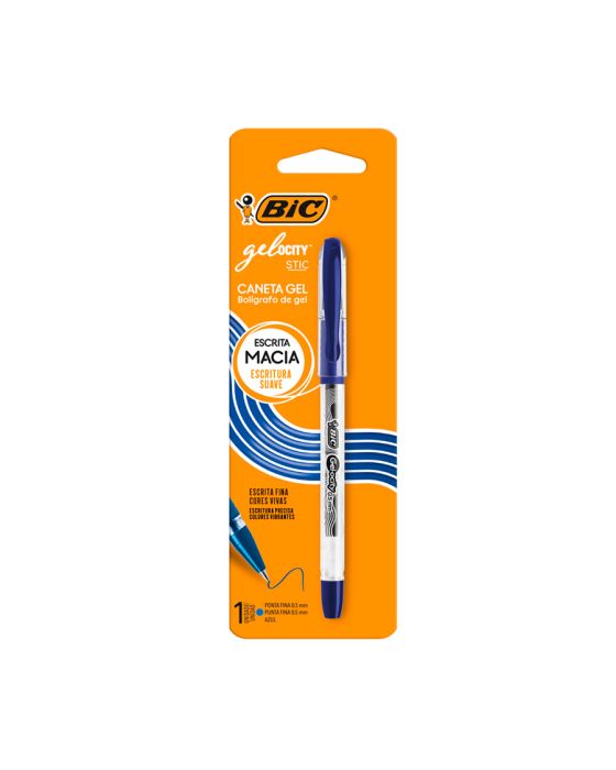 Características:Conheça a nova caneta em gel da Bic!Aproveite a qualidade da Gelocity, a nova caneta em gel da Bic, dispõe de cores vivas, com uma escrita confortável e macia.Conta com ponta fina de 0,5 mm para você obter maior precisão, além de oferecer desempenho confiável para uma variedade de tipos de escrita. aproveite a alta qualidade da Gelocity!Detalhes:- Marca: BIC;- Modelo: Gelocity Stic;- Referência: 9310085;- Linha: Caneta Gel;- Cores: Azul;- Ponta: Ultrafina 0,5mm;- Contém: 1 blister com uma unidade do produto;- Formato: Redondo;- Grip emborrachado;- Escrita Macia e fina;- Cores vivas.Fabricado no Índia | Validade: Indeterminada.Composição:- Tinta gel com corante à base de água, borracha termoplástica, acrilonitrilo-butadieno-estireno (ABS), Aço inoxidável e esfera de carboneto de tugstêncio.Medidas:- Dimensões da embalagem: 20,5 x 6,7 x 1,5cm (CxLxA);- Peso: 100g.ATENÇÃO! NÃO RECOMENDÁVEL PARA CRIANTES DE ATÉ 3 (TRÊS) ANOS POR CONTER PARTE(S) PEQUENA(S) QUE PODEM SER ENGOLIDA(S) OU ASPIRADA(S). CRIANÇAS DE ATÉ 8 ANOS DEVEM UTILIZAR SOB SUPERVISÃO DE UM ADULTO POR CONTER PONTA(S) AGUDA(S) FUNCIONAL(IS).* As especificações podem ser alteradas sem aviso prévio ** Imagem meramente ilustrativa.