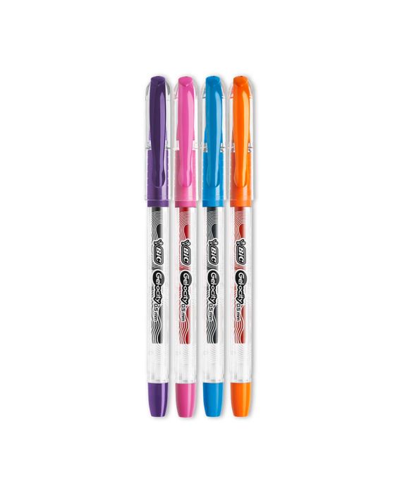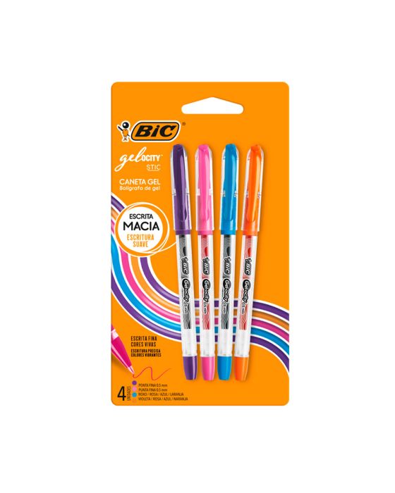 Características:Conheça a nova caneta em gel da Bic!Aproveite a qualidade da Gelocity, a nova caneta em gel da Bic, dispõe de cores vivas, com uma escrita confortável e macia.Conta com ponta fina de 0,5 mm para você obter maior precisão, além de oferecer desempenho confiável para uma variedade de tipos de escrita. aproveite a alta qualidade da Gelocity!Detalhes:- Marca: BIC;- Modelo: Gelocity Stic;- Referência: 9310095;- Linha: Caneta Gel;- Cores: Laranja, Azul, Rosa e Roxo;- Ponta: fina 0,5mm;- Contém: 1 embalagem com 4 cores;- Formato: Redondo;- Grip emborrachado;- Escrita Macia e fina;- Cores mais vivas;Fabricado no Índia | Validade: Indeterminada.Composição:- Tinta gel com corante à base de água, borracha termoplástica, acrilonitrilo-butadieno-estireno (ABS), Aço inoxidável e esfera de carboneto de tugstêncio.Medidas:- Dimensões da embalagem: 19,7 x 10,7 x 1,5cm (CxLxA);- Peso: 150g.ATENÇÃO! NÃO RECOMENDÁVEL PARA CRIANTES DE ATÉ 3 (TRÊS) ANOS POR CONTER PARTE(S) PEQUENA(S) QUE PODEM SER ENGOLIDA(S) OU ASPIRADA(S). CRIANÇAS DE ATÉ 8 ANOS DEVEM UTILIZAR SOB SUPERVISÃO DE UM ADULTO POR CONTER PONTA(S) AGUDA(S) FUNCIONAL(IS).* As especificações podem ser alteradas sem aviso prévio ** Imagem meramente ilustrativa.