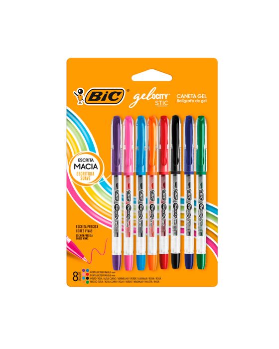 Características:Conheça a nova caneta em gel da Bic!Aproveite a qualidade da Gelocity, a nova caneta em gel da Bic, dispõe de cores vivas, com uma escrita confortável e macia.Conta com ponta fina de 0,5 mm para você obter maior precisão, além de oferecer desempenho confiável para uma variedade de tipos de escrita. aproveite a alta qualidade da Gelocity!Detalhes:- Marca: BIC;- Modelo: Gelocity Stic;- Referência: 9310118;- Linha: Caneta Gel;- Cores: Preto, Azul, Azul Claro, Vermelho, Verde, Laranja, Roxa e Rosa;- Ponta: Ultrafina 0,5mm;- Contém: 1 embalagem com 8 cores;- Formato: Redondo;- Grip emborrachado;- Escrita Macia e fina;- Cores mais vivas;Fabricado no Índia | Validade: Indeterminada.Composição:- Tinta gel com corante à base de água, borracha termoplástica, acrilonitrilo-butadieno-estireno (ABS), Aço inoxidável e esfera de carboneto de tugstêncio.Medidas:- Dimensões da embalagem: 21 x 14 x 1,5cm (CxLxA);- Peso: 150g.ATENÇÃO! NÃO RECOMENDÁVEL PARA CRIANTES DE ATÉ 3 (TRÊS) ANOS POR CONTER PARTE(S) PEQUENA(S) QUE PODEM SER ENGOLIDA(S) OU ASPIRADA(S). CRIANÇAS DE ATÉ 8 ANOS DEVEM UTILIZAR SOB SUPERVISÃO DE UM ADULTO POR CONTER PONTA(S) AGUDA(S) FUNCIONAL(IS).* As especificações podem ser alteradas sem aviso prévio ** Imagem meramente ilustrativa.