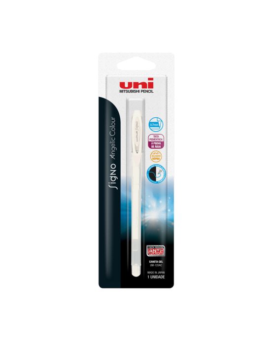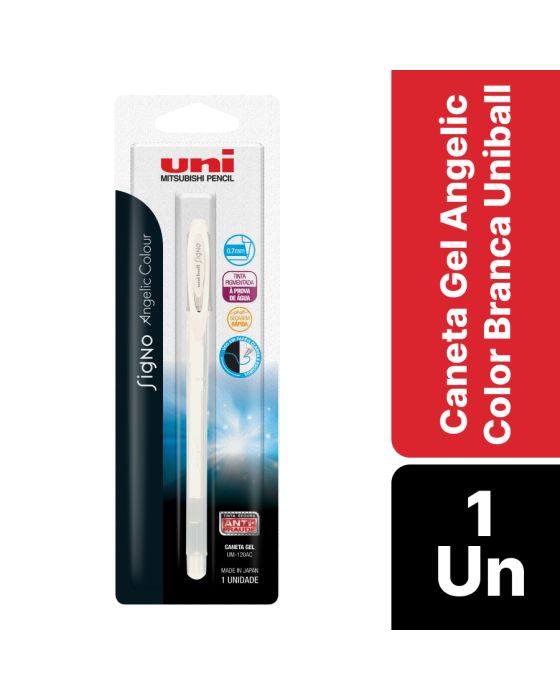 Características:Com a Caneta Gel Angelic Colour Branca Uniball, você terá mais conforto e qualidade na escrita devido a sua ponta de 0.7mm e secagem rápida, além de tinta impermeável e antifraudes. Ideal para escrever em folhas claras e/ou pequenas!Detalhes:- Marca: Uniball;- Modelo: Signo Angelic Colour;- Referência: UM-120AC;- Linha: Caneta Gel;- Cor: Branca;- Contém: 1 blister com 1 unidade do produto;- Ponta média: 0,7mm;- Ponta de aço tungstênio que permite uma escrita rápida e menor atrito sobre o papel;- Tinta pigmentada à prova de água;- Secagem rápida;- Tinta segura antifraudes.Fabricado no Japão. | Validade: Indeterminada.Ideal para:- Ideal para uso em papéis claros e escuros.Recomendações:- Evitar temperaturas acima de 45°C e exposição direta aos raios solares;- Estocar em local seco e ventilado.Composição:- Resinas termoplásticas, tinta à base de solventes e corantes orgânicos, e componentes metálicos.Medidas:- Dimensões da embalagem: 19,8 x 6,3 x 1,5cm (CxLxA);- Dimensões do produto: 15,5 x 1,5 x 1cm (CxLxA);- Peso: 79g.Produto certificado pelo INMETRO 009522/2013 OCP 00061.ATENÇÃO! NÃO RECOMENDÁVEL PARA CRIANÇAS DE ATÉ 3 (TRÊS) ANOS POR CONTER PARTE(S) PEQUENA(S) QUE PODEM SER ENGOLIDA(S) OU ASPIRADA(S). CRIANÇAS DE ATÉ 8 ANOS DEVEM UTILIZAR SOB SUPERVISÃO DE UM ADULTO POR CONTER PONTA(S) AGUDA(S) FUNCIONAL(IS).* As especificações podem ser alteradas sem aviso prévio ** Imagem meramente ilustrativa.