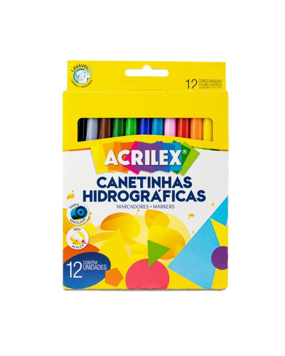 Caracteristicas:Faça desenhos e pinturas incríveis nos mais diversos tipos de papeis para os seus projetos, são 12 cores para trazer alegria a cada traço!Detalhes:- Marca: Acrilex.- Modelo: 06902.- Linha: Canetinhas Hidrográficas.- Cores: 12 cores variadas.- Contém: 1 estojo com 12 cores.- Ponta: 2mm.- Não Acalca.- Tampa ventilada.- Não tóxica.- Ponta fina e resistente.- Lavável.- Tampe após o uso.Cores:- Amarelo Ouro, Laranja, Vermelho, Cenoura, Rosa, Lilás, Turquesa, Azul Celeste, Azul Turquesa, Verde Musgo, Marrom e Preto.Onde usar:- Papéis cartão, cartolina e papel comum.Composição:- Resina termoplástica, Água, Corantes, Umectantes, Ponta e pavio de poliéster.Em caso de manchas:- Lave o tecido imediatamente.- Em caso de manchas de difícil remoção, repita o processo de lavagem.Recomendações:- Evite temperaturas acima de 45ºC e exposição direta aos raios solares.ATENÇÃO! Não recomendável para crianças de até 3 (três) anos por conter partes pequenas que podem ser engolidas ou aspiradas.* As especificações podem ser alteradas sem aviso prévio ** Imagem meramente ilustrativa.