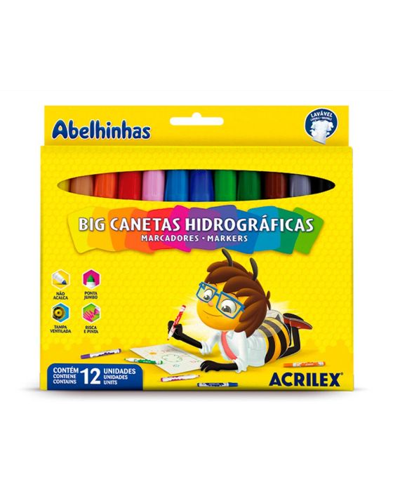 Caracteristicas:As Big Canetas Hidrográficas Acrilex de ponta média e resistente, são perfeitas para desenhar, pintar e fazer tracejados sobre papel, papel cartão e cartolina estimulando a criatividade das crianças!Detalhes:- Marca: Acrilex.- Modelo: Big Canetas.- Linha: Canetas hidrográficas.- Cores: 12 cores.- Contém: 1 embalagem com 12 cores mistas.- Formato: Jumbo, para mãos pequenas.- Ponta média e resistente.- Para trabalhos artísticos e escolares.- Escreve e pinta.- Lavável.- Ponta jumbo.- Não acalca e não afunda.Ideal para:- Para desenhar, pintar e fazer tracejados sobre papel, papel cartão e cartolina.* As especificações podem ser alteradas sem aviso prévio ** Imagem meramente ilustrativa.