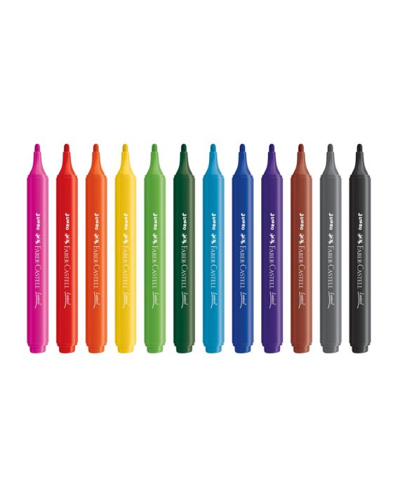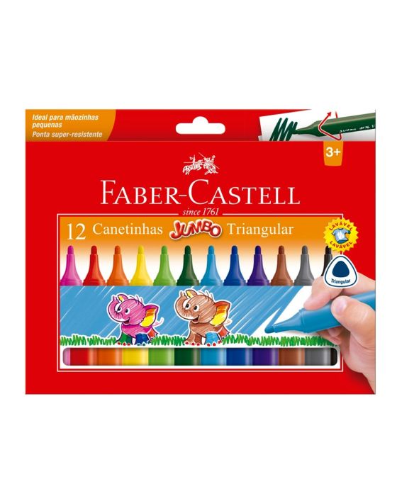 Caracteristicas:As canetinhas hidrográficas da linha Jumbo Faber-Castell estimulam a criatividade das crianças com a formulação exclusiva de corantes de alta qualidade com cores mais vivas. Faça o momento de aprendizado mais divertido!Detalhes:- Marca: Faber-Castell.- Modelo: 15.0212J.- Linha: Jumbo.- Cores: 12 cores (Vermelho, Amarelo, Verde, Azul Claro,Azul Escuro, Marrom,Preto,Rosa Claro,Rosa,Laranja,Verde Claro e Violeta). - Contém: 1 estojo de lápis jumbo com 12 cores.- Jumbo triangular: formato ergonômico ideal para mãozinhas pequenas.- Ponta super-resistente.- Lavável.- Produto é atóxico.ATENÇÃO! O produto não é removível de papéis e pintura de parede, superfícies plásticas, madeiras e outros materiais os quais não podem ser lavados.* As especificações podem ser alteradas sem aviso prévio ** Imagem meramente ilustrativa.
