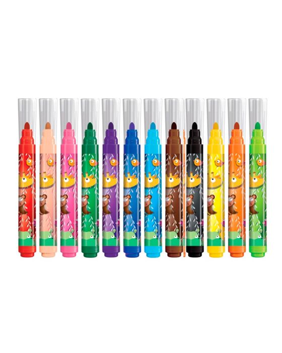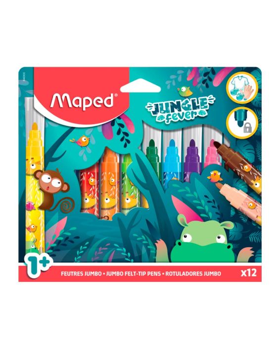 Características:Os pequenos ficarão super felizes em aprender a colorir com essas canetinhas jumbo decoradas! Na caixa, 12 cores super vivas de canetinhas! As crianças poderão aprender os nomes dos animais que estão representados no corpo das canetinhas!Detalhes:- Marca: Maped;- Modelo: Jungle Fever;- Referência: 846900;- Linha: Canetas Hidrográficas;- Cores: Vermelho, Rosa claro, Rosa escuro, Verde, Roxo, Azul escuro, Azul claro, Marrom, Preto, Amarelo, Laranja e Verde;- Contém: 1 Blister com 12 unidades do produto;- Ponta: 5.0mm;- Corpo: Redondo;- O diferencial: a ponta bloqueada e larga (5 mm), que não é perigosa para as crianças;- Ponta de segurança: travada em ambas as direções para evitar perfuração ou arrancamento;- Corpo com nome dos personagens;- Tampa transparente;- Tinta ultra lavável em tecidos e pele com água e sabão.Fabricado na China | Validade: Indeterminada.Armazenamento:- Armazenar em local seco e ventilado.Composição:- Polipropileno, tinta atóxica e pigmentos.Medidas:- Dimensões da embalagem: 19 x 16,7 x 1,8cm (CxLxA);- Peso: 173g.ATENÇÃO! NÃO RECOMENDÁVEL PARA CRIANÇAS MENORES DE 4 (QUATRO) ANOS POR CONTER PARTE(S) PEQUENA(S) QUE PODE(M) SER ENGOLIDA(S) OU ASPIRADA(S) E PONTA(S) AGUDA(S) FUNCIONAL(IS). CRIANÇAS ENTRE 5 (CINCO) E 8 (OITO) ANOS SOMENTE DEVEM UTILIZAR SOBR SUPERVISÃO DE UM ADULTO.* Registro Inmetro: 005053/2019.* As especificações podem ser alteradas sem aviso prévio ** Imagem meramente ilustrativa.