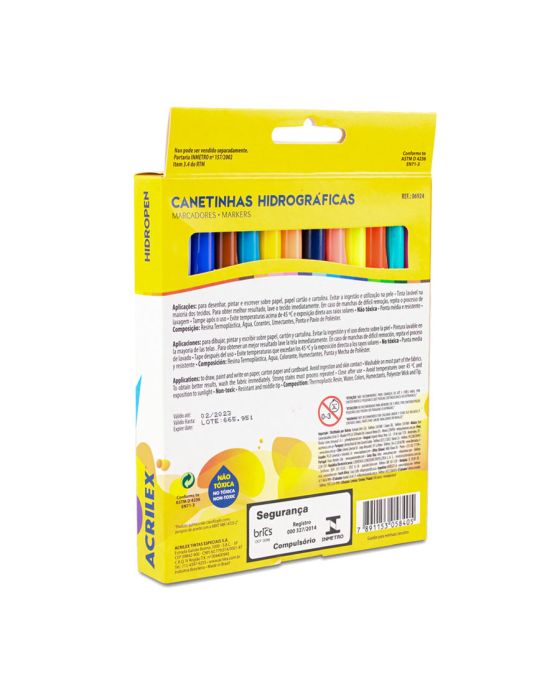 Caracteristicas:As Canetas Hidrográficas Acrilex são de ponta média e resistente, perfeitas para desenhar, pintar e fazer tracejados sobre papel, papel cartão e cartolina estimulando a criatividade das crianças!Detalhes:- Marca: Acrilex.- Modelo: 06924.- Linha: Canetas Hidrográficas.- Cores: 24 cores.- Contém: 1 unidade do produto com 24 cores mistas.- Ponta média e resistente.- Não acalca e não afunda.- Lavável.Ideal para:- Para desenhar, pintar e fazer tracejados sobre papel, papel cartão e cartolina.Conservação:- Tampe após o uso.- Evite temperaturas acima de 45ºC e exposição direta aos raios solares.Composição:- Resina Termoplástica, Água, Corantes, Umectantes, Ponta e pávio de Poliéster.* As especificações podem ser alteradas sem aviso prévio ** Imagem meramente ilustrativa.